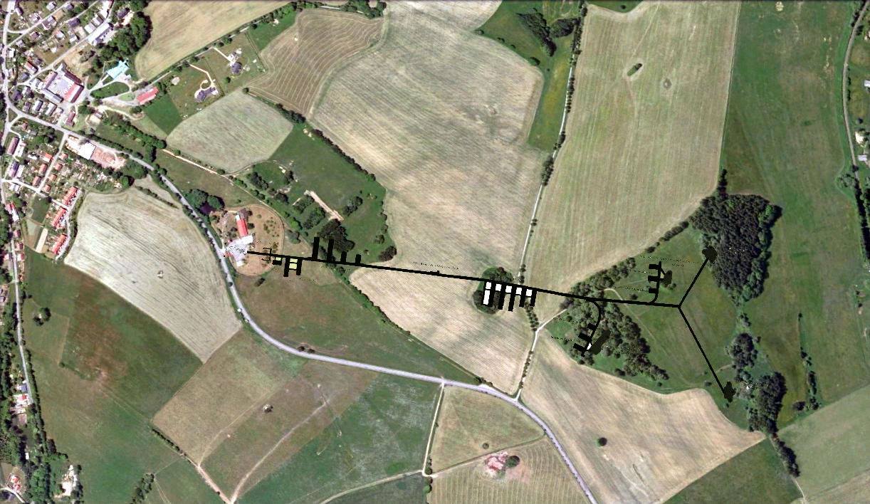 Pokus o superprojekci plánku podzemních chodeb dělostřelecké tvrze Hůrka a snímku z Google Earth