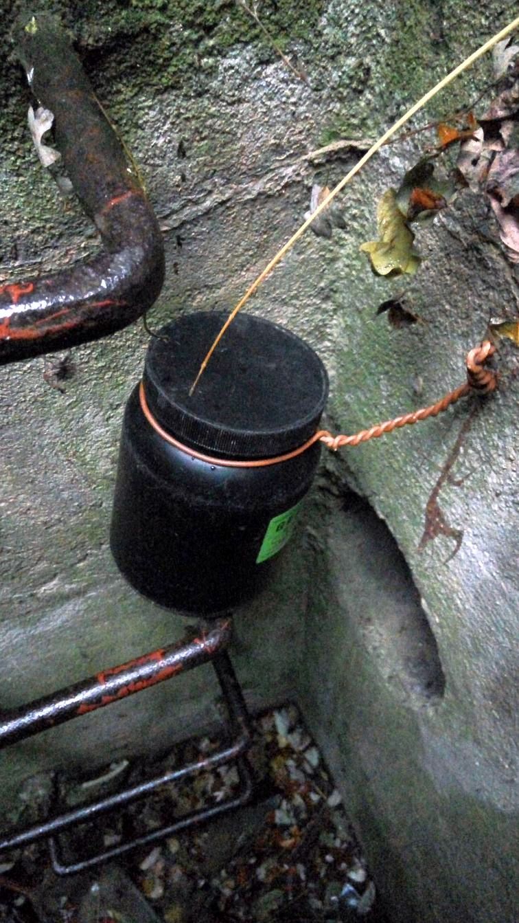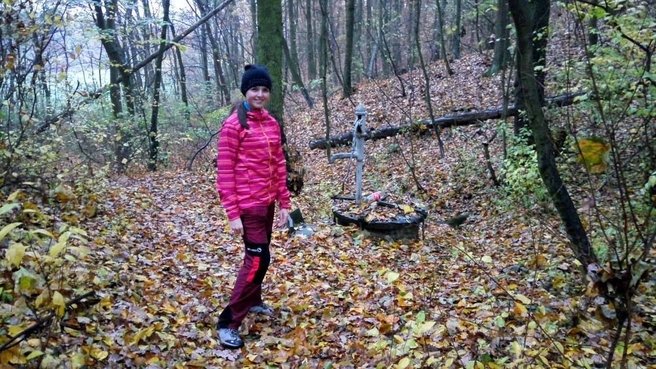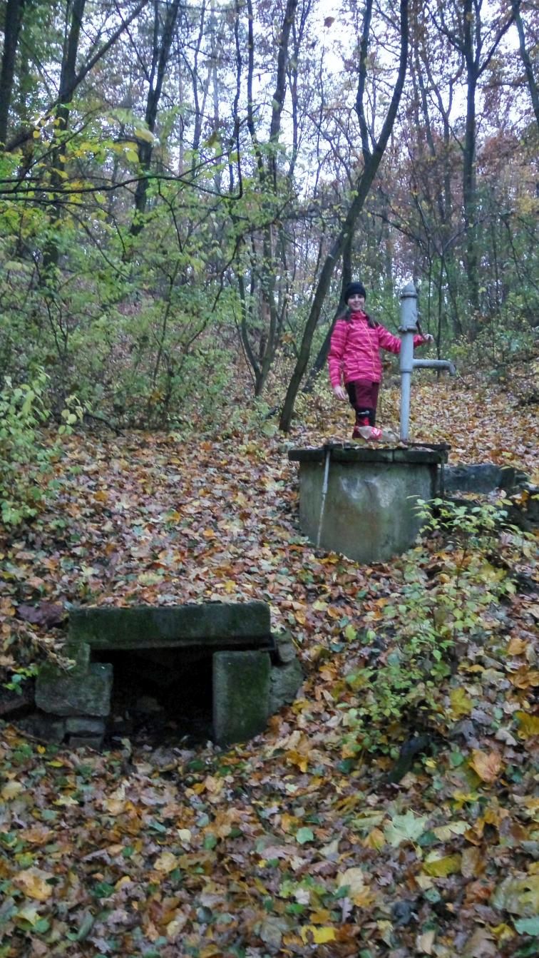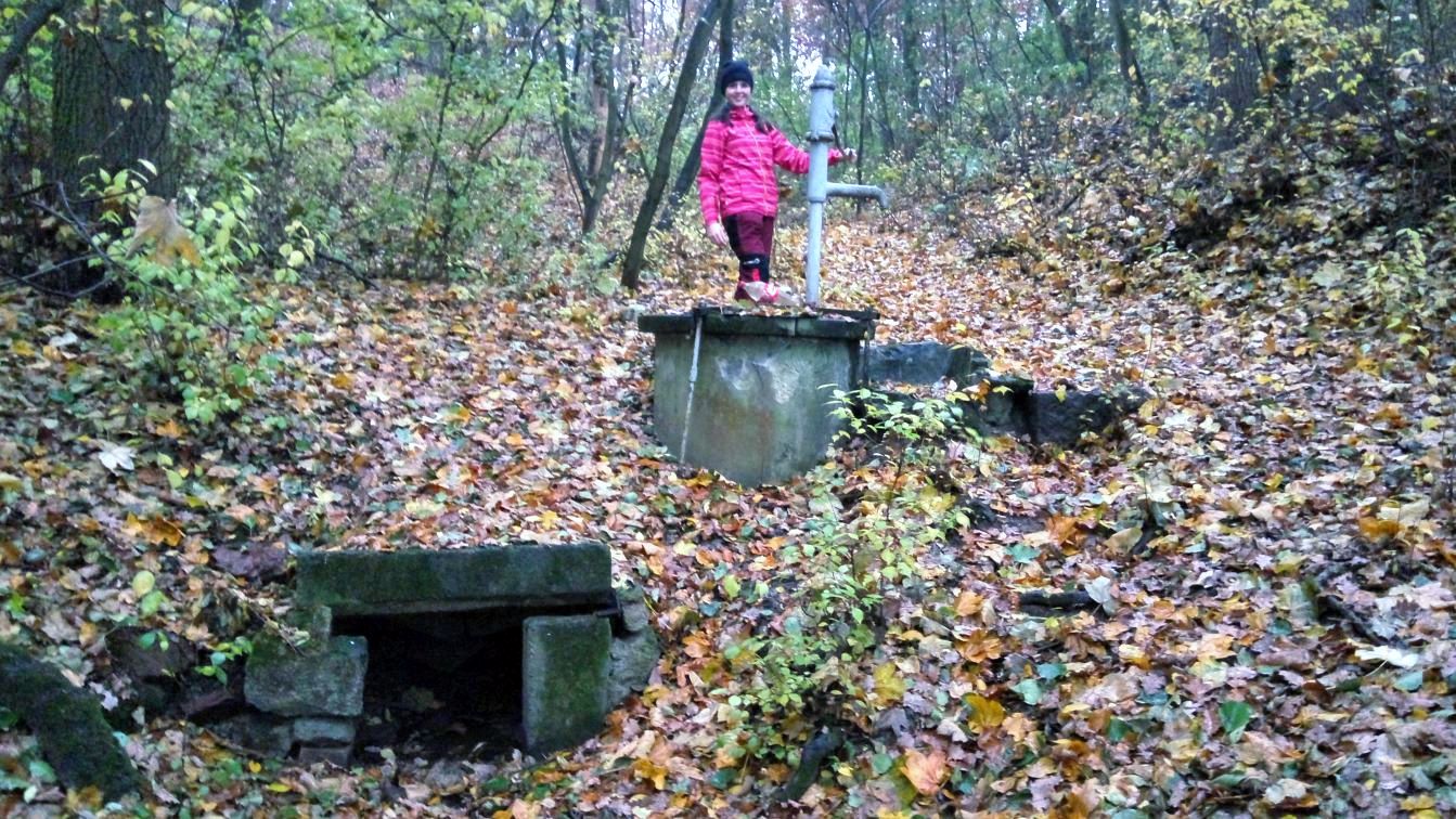 Mezi tím se nám trochu rozpršelo a my to otočili zpátky k autu. Po pár krocích jsme ale s Madlenkou zjistili, že nám ten déšť zase až tak nevadí, a že máme ještě dost času. Tak jsme na sebe mrkli a vyrazili pro další kešku – GC4PYDV Ztracena pumpa. Pumpu jsme našli – je fakt uprostřed ničeho v lese. A dokonce pumpuje. Kešku jsme ale nenašli. Pravda zase moc důkladně jsme nehledali, protože usilovně pršelo, ale na podezřelých místech prostě nebyla. O důvod víc se sem vrátit za pěkného počasí.