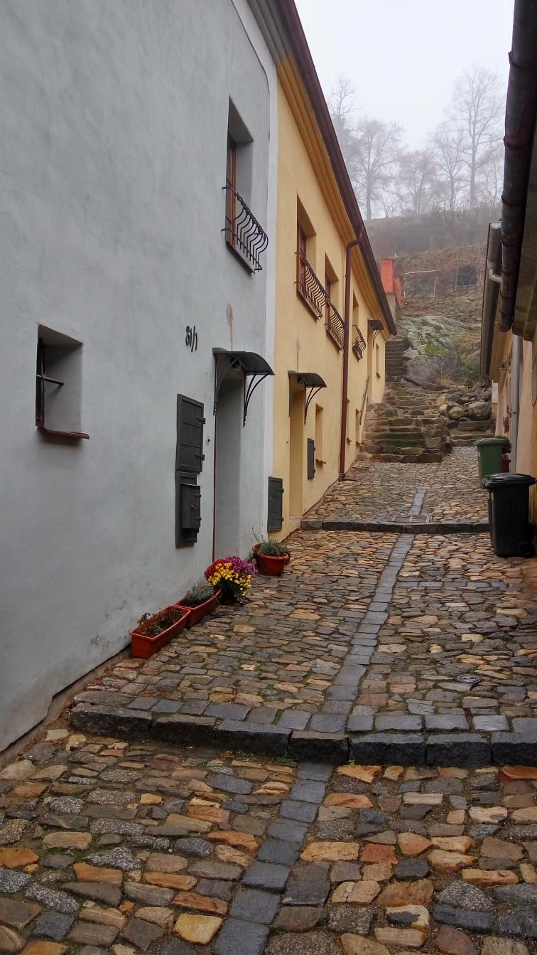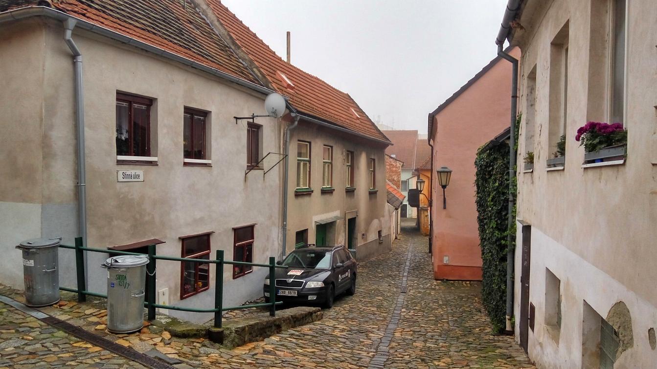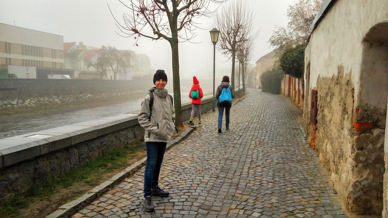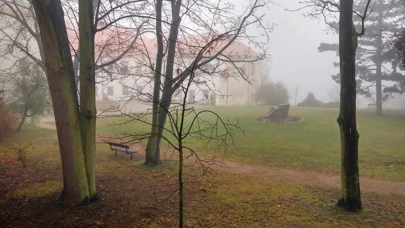 Den boje za svobodu a demokracii, 17. listopad, volný den. Dopoledne vracíme kamarádku, co si přijela do Brna připomenout studentské časy do Velkého Meziříčí. Původní plán byl projít se přímo u Mezříče Balinským údolím, ale sychravá mlha nám tento plán kazí. Volba tedy padá na blízkou Třebíč. Takže volně na slova Wabiho Daňka: Jedem si to ku Třebíči, počasí je prostě špatný...
