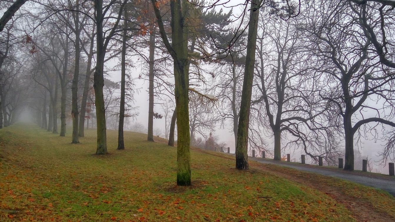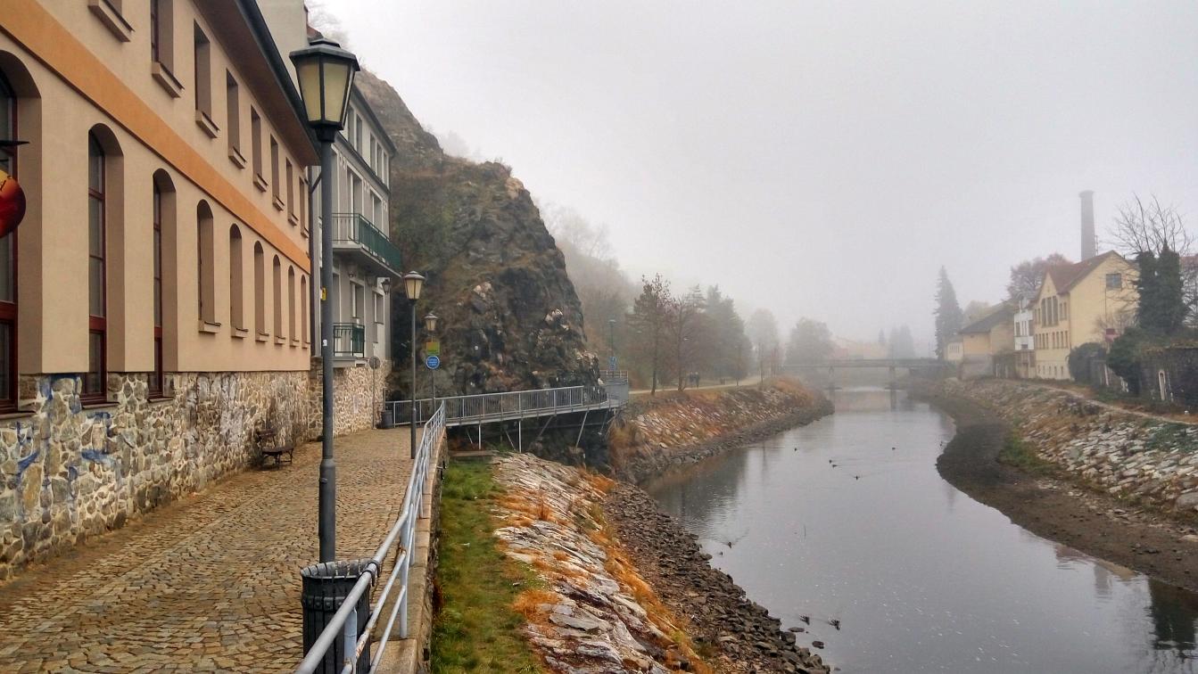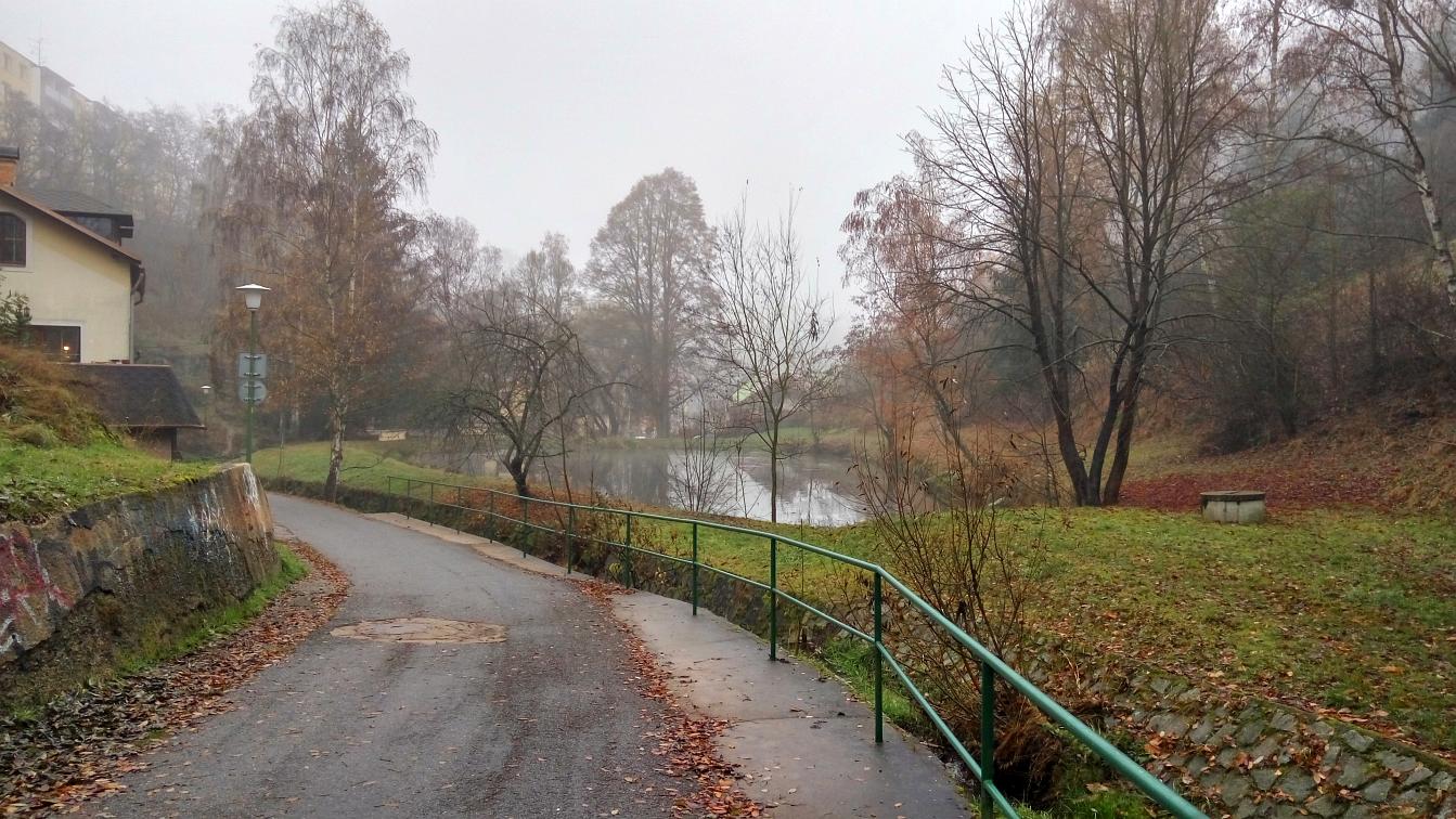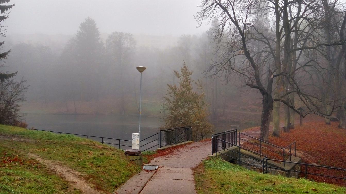 Den boje za svobodu a demokracii, 17. listopad, volný den. Dopoledne vracíme kamarádku, co si přijela do Brna připomenout studentské časy do Velkého Meziříčí. Původní plán byl projít se přímo u Mezříče Balinským údolím, ale sychravá mlha nám tento plán kazí. Volba tedy padá na blízkou Třebíč. Takže volně na slova Wabiho Daňka: Jedem si to ku Třebíči, počasí je prostě špatný...