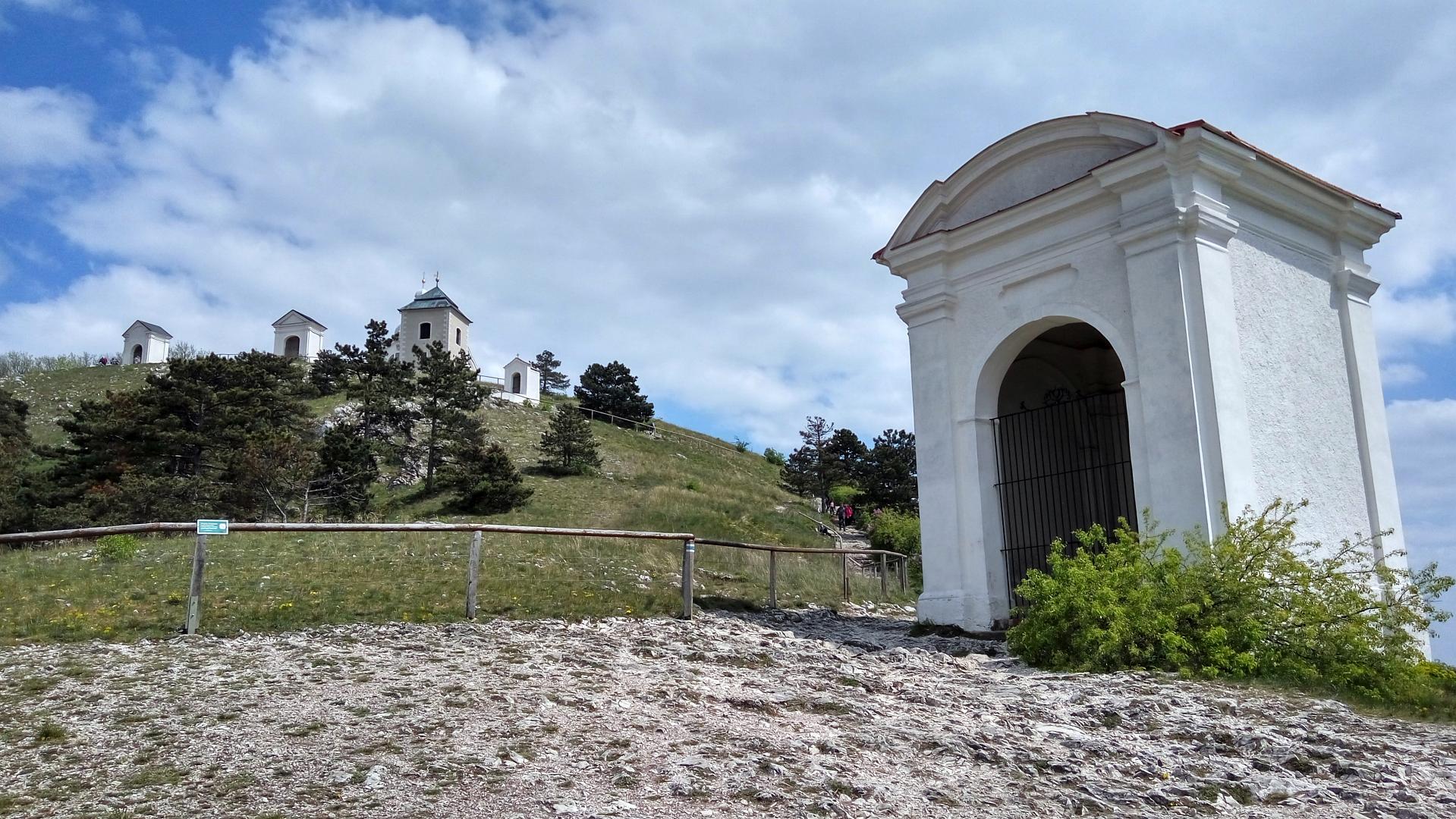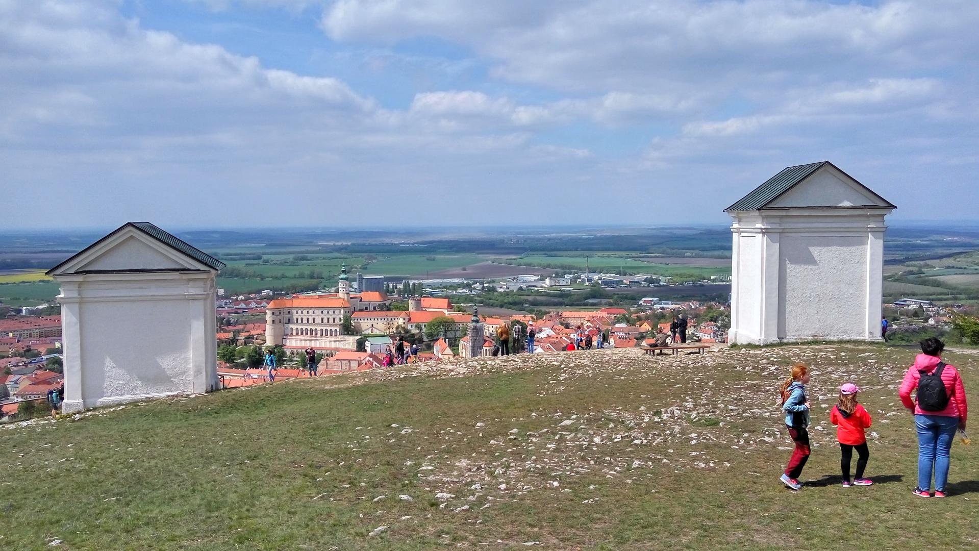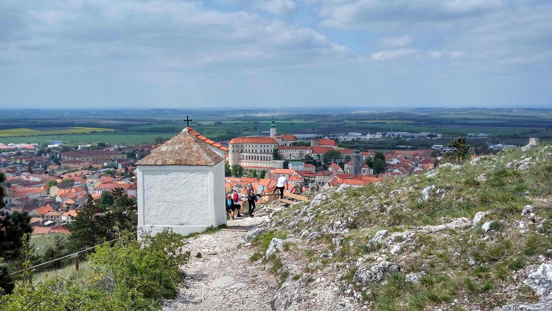 Na vrcholu u kaple sv. Šebestiána se nám otevřel výhled na Mikulov s dominantním zámkem. Dolů do mesta jsme sestoupili po Křížové cestě. Je poněkud kamenitá, takže jde buď se kochtat výhledy nebo jít, ale ne obojí zároveň.