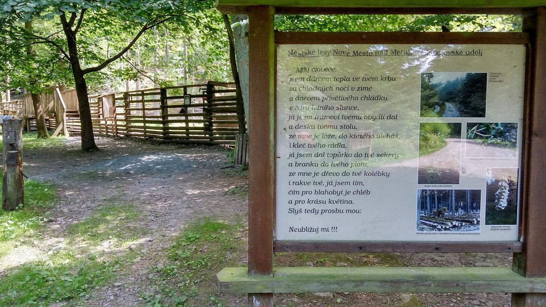 Výlet, který vznikl dvojitou náhodou: Před lety jsme při návratu z Krkonoš omylem zajeli na Husovo náměstí v Novém Městě nad Metují a moc se nám to líbilo. Tehdá jsme ale neměli čas na návštěvu. Nyní se nám Nové Město nad Metují postavilo do cesty , když jsme jeli do Bartoňovi turistické útulny Peklo, kde jsme měli zamluvený nocleh a odkud jsme měli druhý den vyrazit na náš hlavní cyklo-výlet na Pevnost Dobrošov, Jiráskovu chatu a pár dalších pevnostních srubů v okolí. Tentokrát jsme měli času dost, tak jsme zastavili a vyrazili na procházku do blízkého okolí Nového Města nad Metují s cílem skončit na Husově náměstí u zámku.