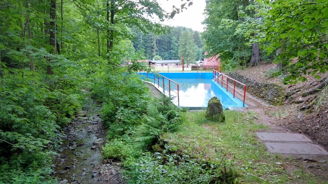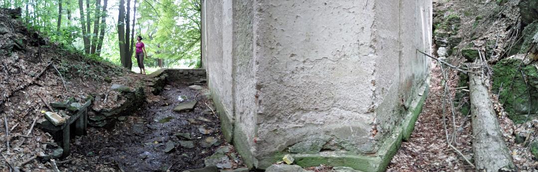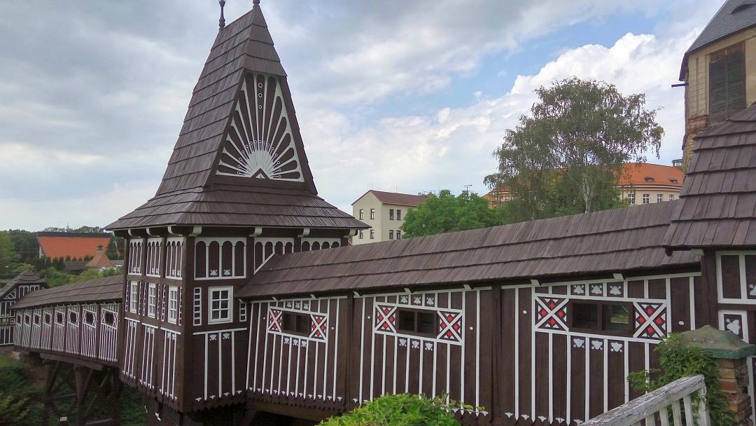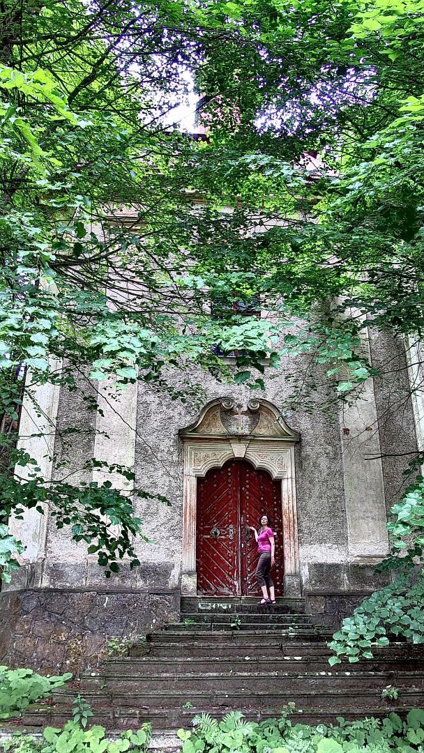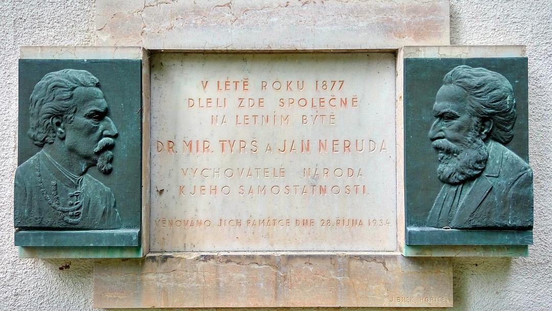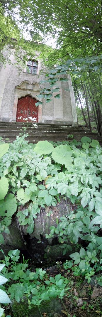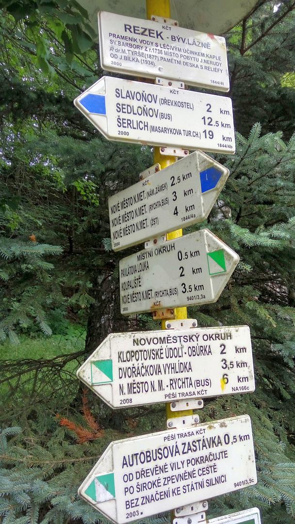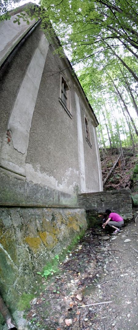 Vystoupali jsme nahoru na kopec, přešli silnici na Blažkov a ocitli se na místě zvaném Ve vilách, odkud je nádherný výhled na Nové Město nad Metují. Hned první vila je unikát od architekta Dušana Jurkoviče – celodřevěná vila továrníka Bartelmuse. Pokračovali jsme k bývalým lázním Rezek, kde spolu dle pamětní cedule v létě 1877 společně dleli Tyrš s Nerudou. V areálu lázní je barokní kaple sv. Barbory, kde se pod oltářem vyvěrá léčivý pramen – studánka sv. Barbory, který je pak vyveden mimo kapli. Celý areál lázní je opuštěný – údajně kvůli kontaminaci pramene (ale to mám jen jako nepotvrzenou informaci).