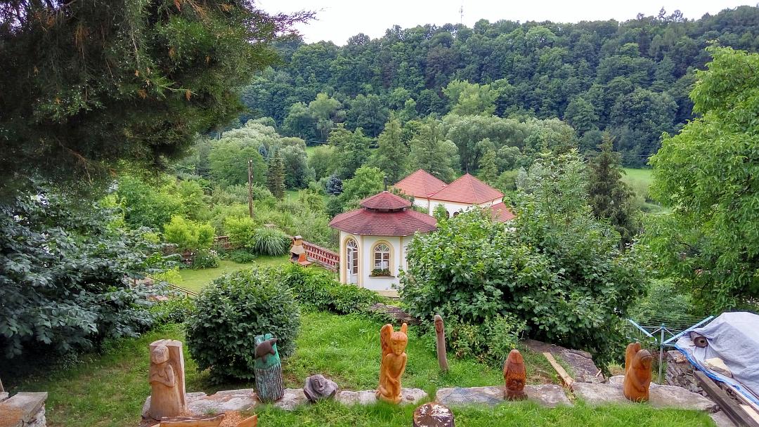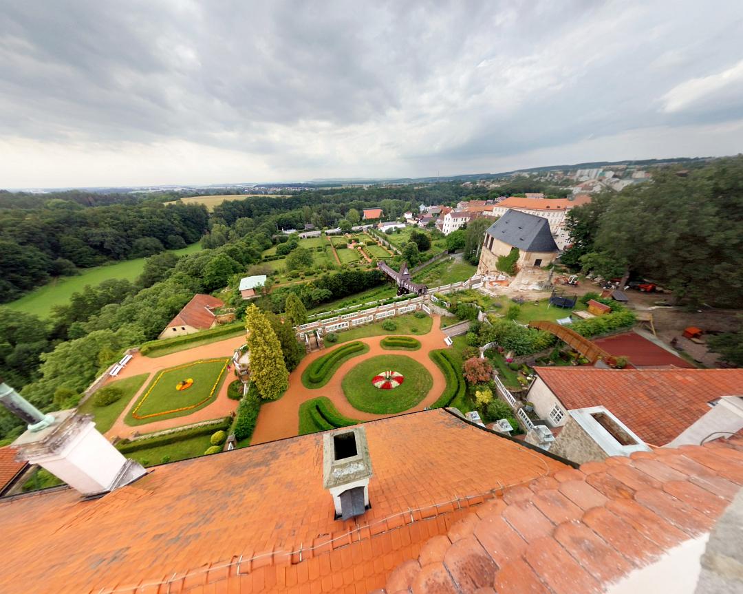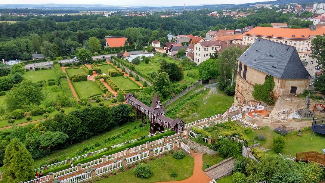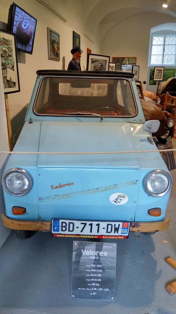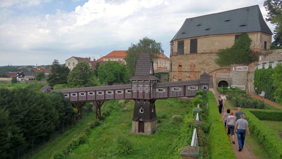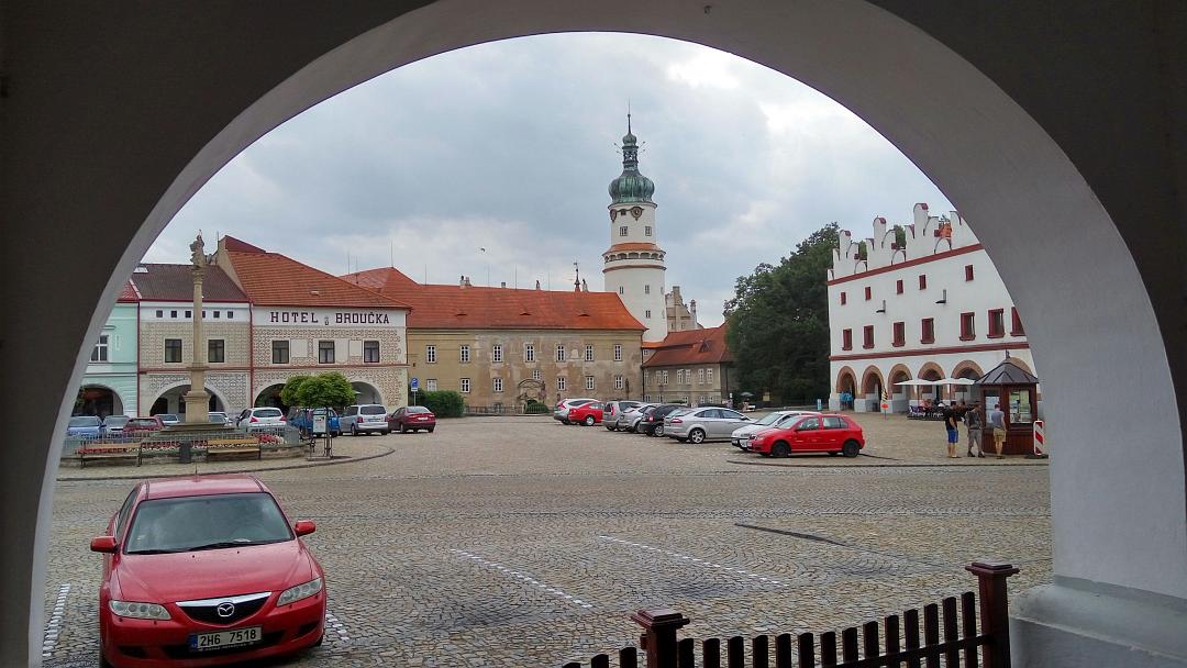 Seběhli jsme po naučné stezce na Pavlátovu louku, kde právě probíhal letní dětský tábor a pokračovali dále po zelené značce směrem k Novému Městu nad Metují. Cestou nás ještě překvapil Divočaur a Branka přání a už jsme stoupali ulící Pod Hradbami pod hradbami. Obešli jsme Husovo náměstí, navštívili Kostel Nejsvětější Trojice a vydali se na zámek. Tady jsme vyšplhali na zámeckou věž s nádherným rozhledem na náměstí, nádvoří i terasovitou zahradu. Ostatně po zahradě, na které se nachází Jurkovičův krytý dřevěný most a barokní sošky trpaslíků od Matyáše Brauna jsme se potom i prošli. Nakonec jsme si prohlédli expozici automobilů Velorex.