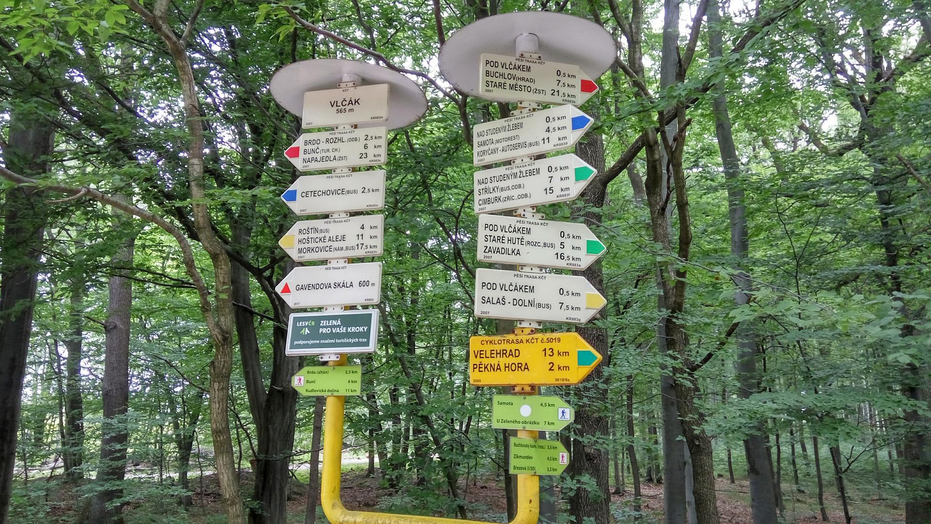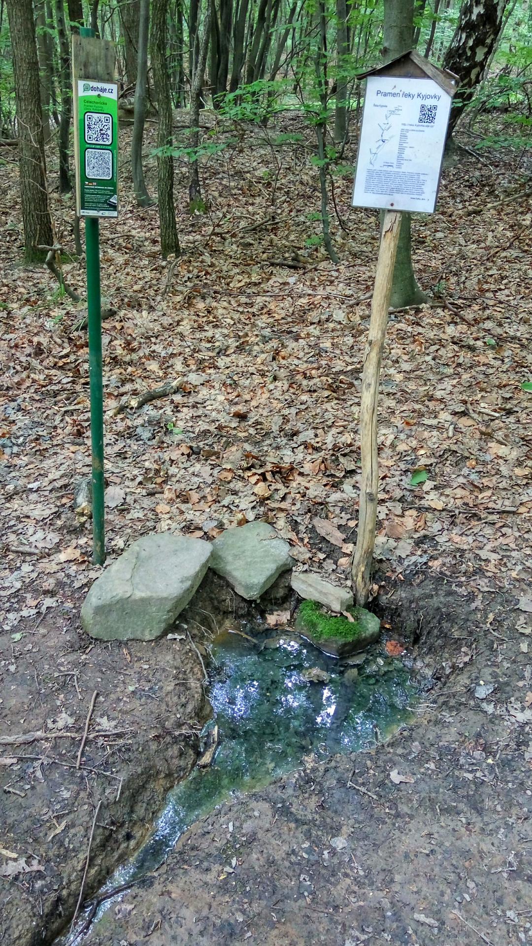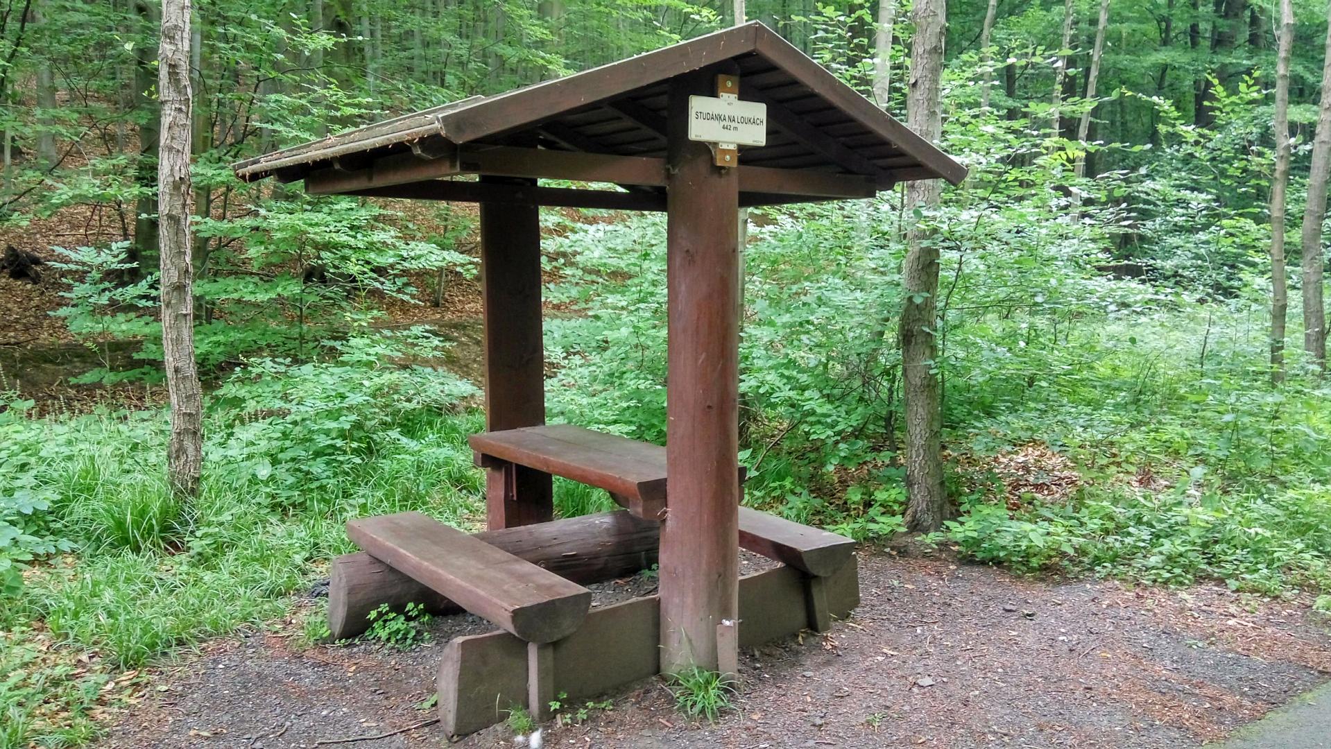 Vyrážíme do kopečka po zelené a už po pár metrech míjíme v místech, kde dříve stávala sklářská huť, mohutnou Malíkovu lípu s altánkem na odpočinek. Zhruba po kilometru na nás čeká studánka Na Loukách, u které je také turistický přístřešek. Těch ostatně dnes potkáme opravdu hodně! Po půl kilometru scházíme z asfaltové cesty vlevo a držíme se zelené turistické značky, která pomalu, ale vytrvale šplhá údolím Kyjovky až k rozcestníku Pod Vlčákem (přístřešek). Spojují se zde zelená, červená a žlutá značka a společně vedou kolem turistického přístřešku Vlčák a pramene Kyjovky k rozcestí Vlčák, které je přímo u stejnojmenné samoty.