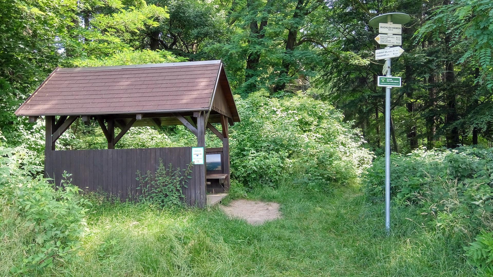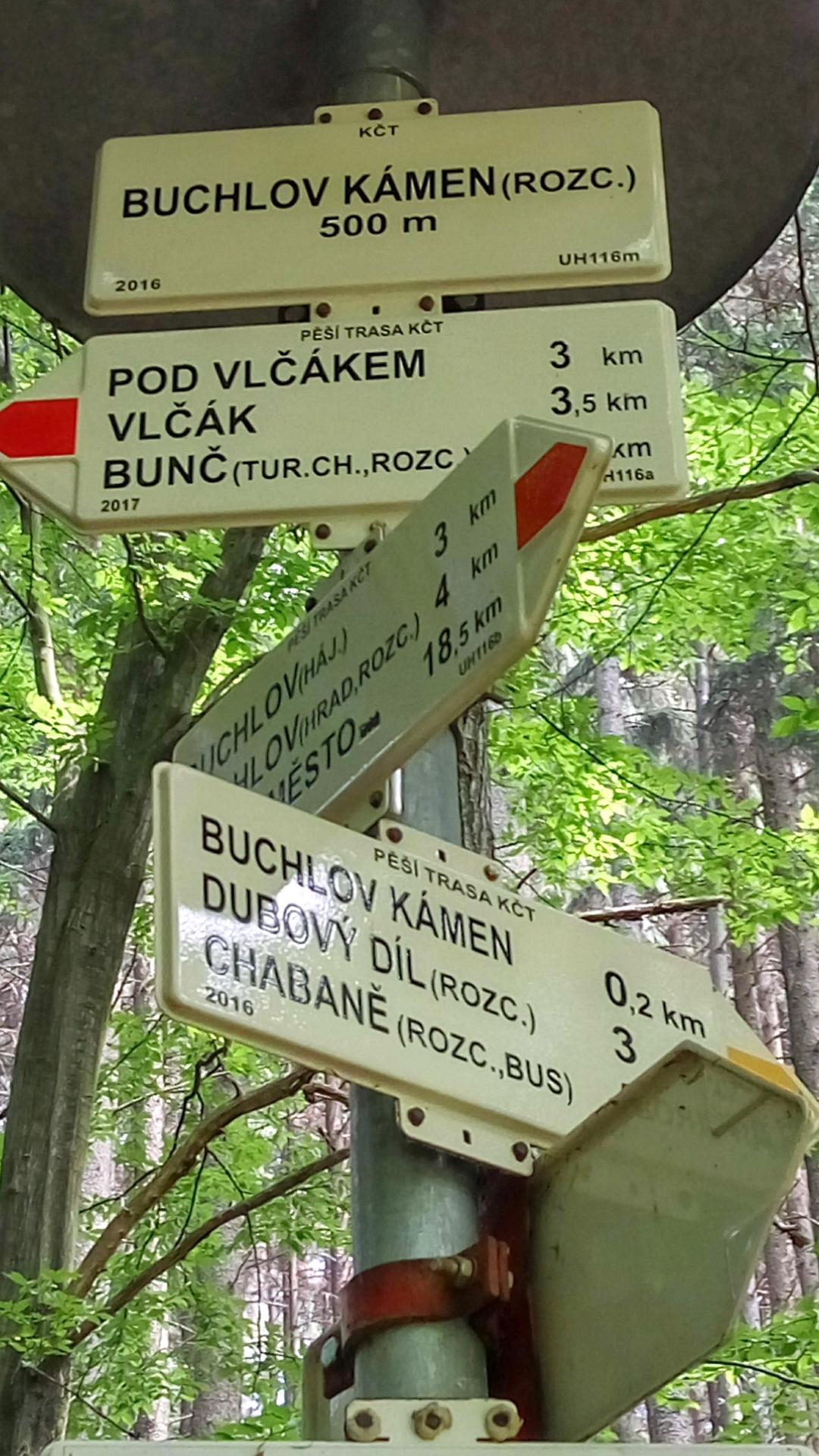 Zpáteční cestu jsme zvolili po červené turistické značce (takže jsme se až k rozcestí Pod Vlčákem vraceli po stejné cestě). Dále vede červená skoro po rovině po asfaltce (cestou další turistický přístřešek), která po dvou kilometrech utíká doleva a značka pokračuje přes louku s nádhernými výhledy na západní část Chřibů až k rozcestí pod Buchlovským kamenem. Odtud je to už jen 200 metrů do kopečka kolem lesa k dalšímu rozcestníku s turistickým přístřeškem. Hned 20 metrů za ním je v lese schovaný Velký Buchlovský kámen a o nějakých 100 metrů dál i Malý Buchlovský kámen. Velký Buchlovský kámen využívají i skálolezci a je na něm odjištěno několik cest.