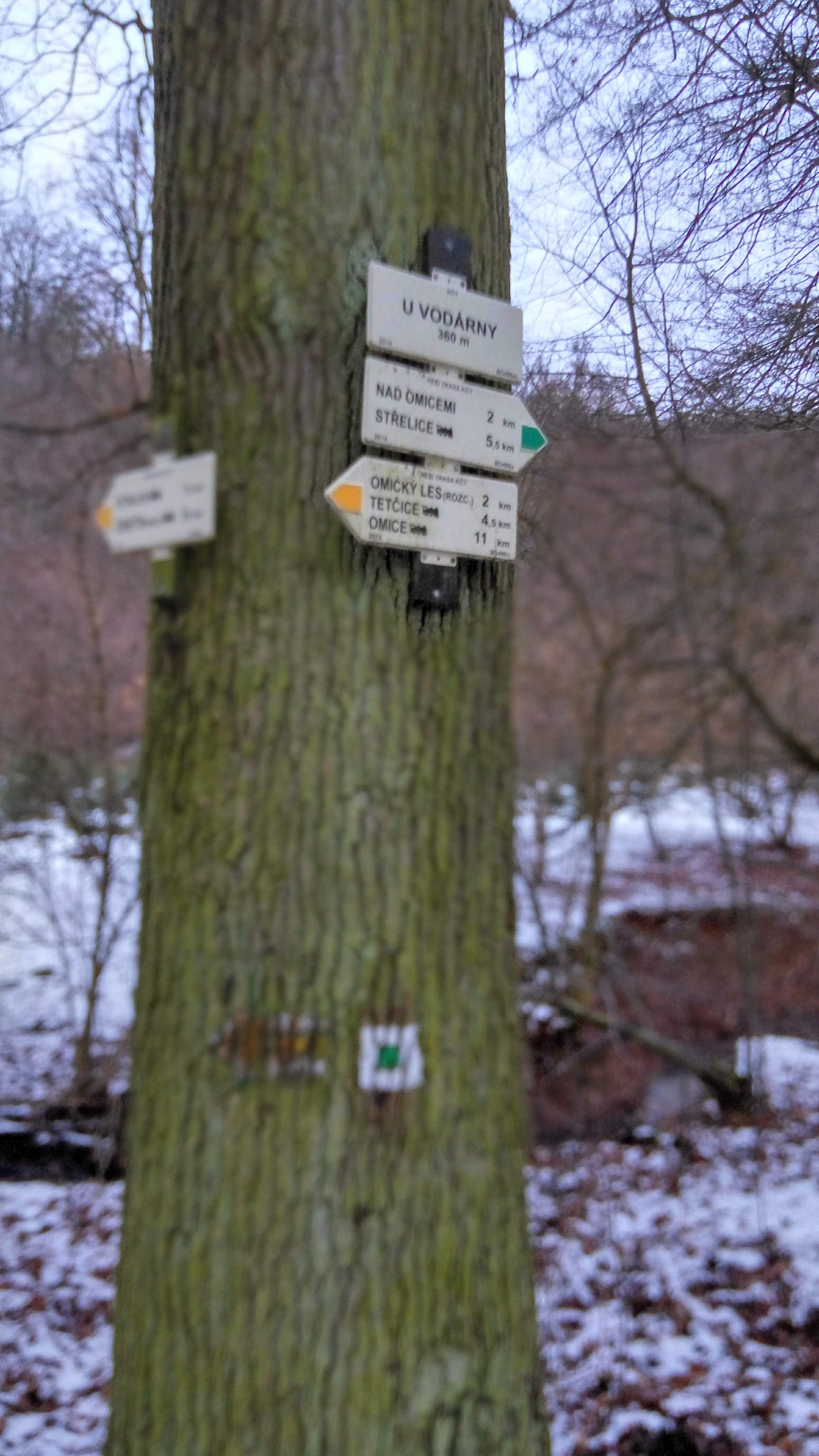 Hvízdalku jsme obešli lesem a dali se po žluté turistické značce doprava směrem k rozcestí U vodárny. Tam jsem si také odlovil moc pěkně udělanou geocache GC4NCZW Vodarna. Dál jsme pokračovali po zelené, která nás dovedla k silnici, po které jsme se vrátili do Omic.