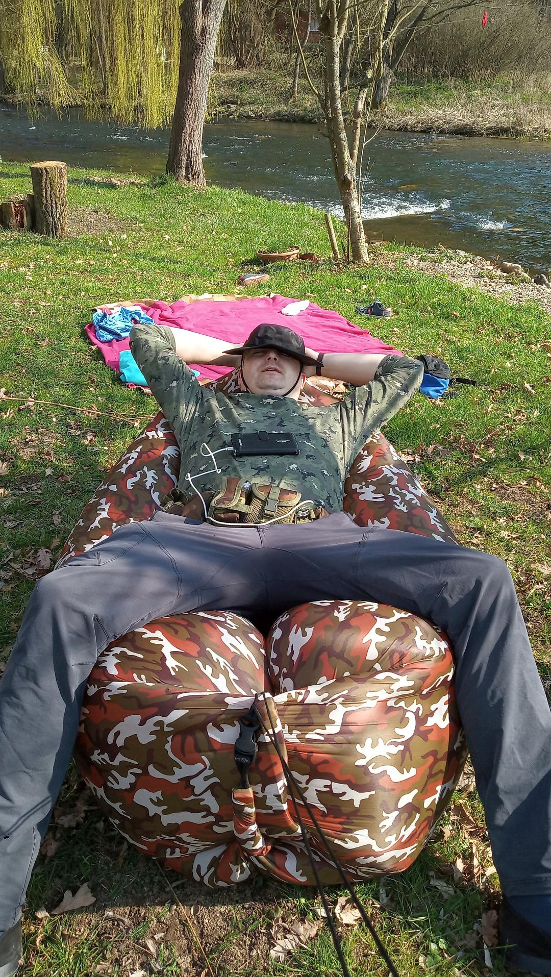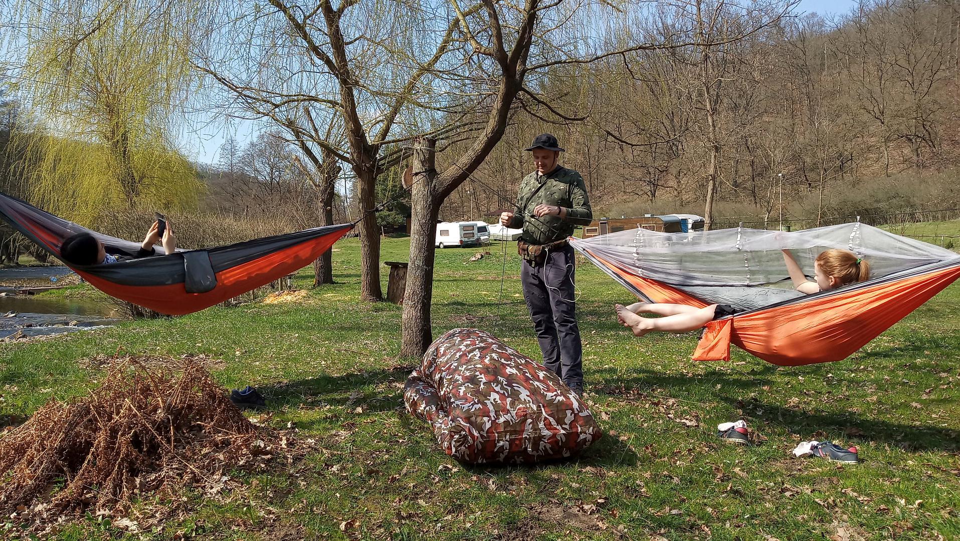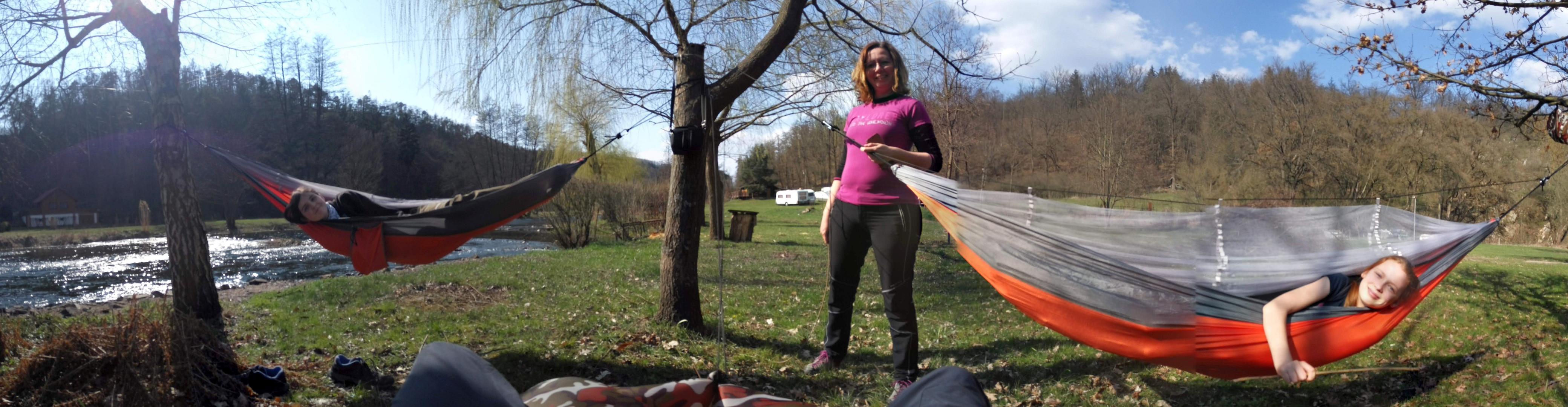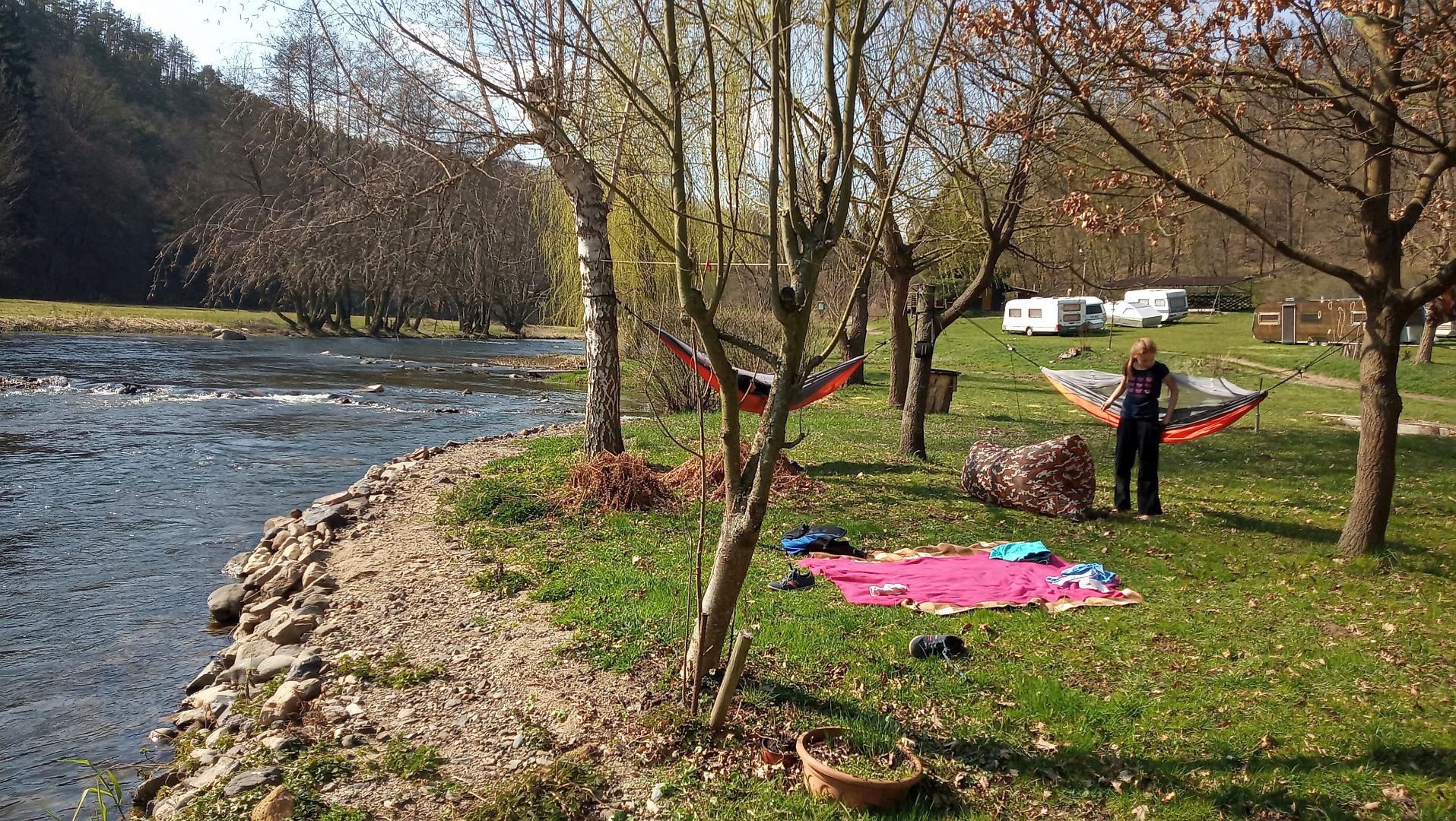 Po obědě v Dalešickém Pivovaru jsme popojeli k řece Jihlavě pod Mohelnem, kde jsme si na veřejném tábořišti Fiola mastňácky pověsili hamaky a nafoukli jitrnici a užívali si šumění vody a jarního sluníčka.