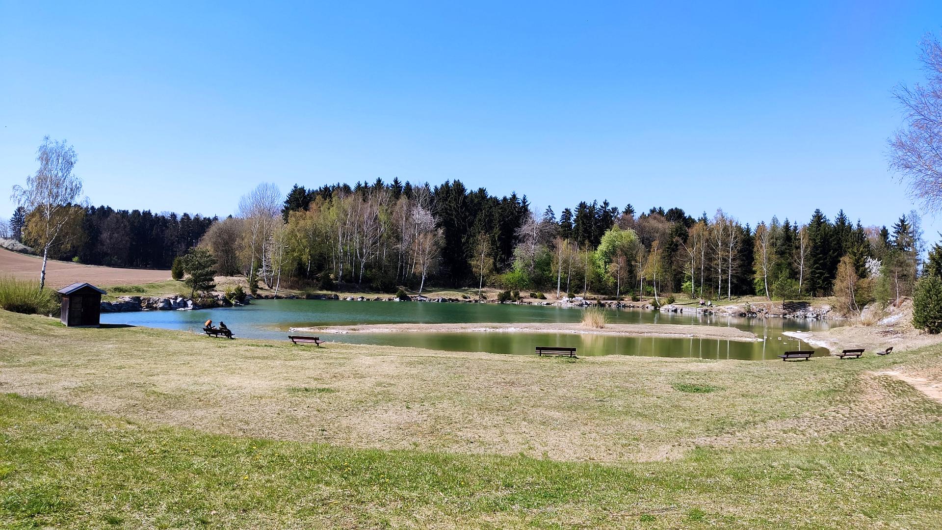 Cestu zpět jsme volili lesem kolem rybníčku s kapry. V Dolní Rožínce jsme ještě obešli Návesní rybník (opět plný kaprů) a z venku si prohlédli Strašidelný zámek Draxmoor. Před objezdem jsme ještě chvíli poseděli u zatopeného lomu, kde je v létě pěkné koupání.