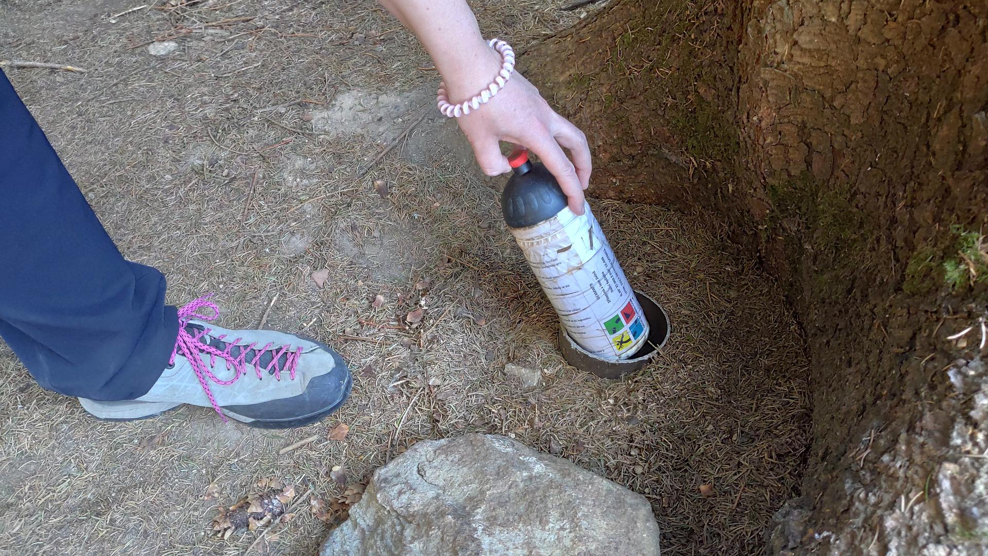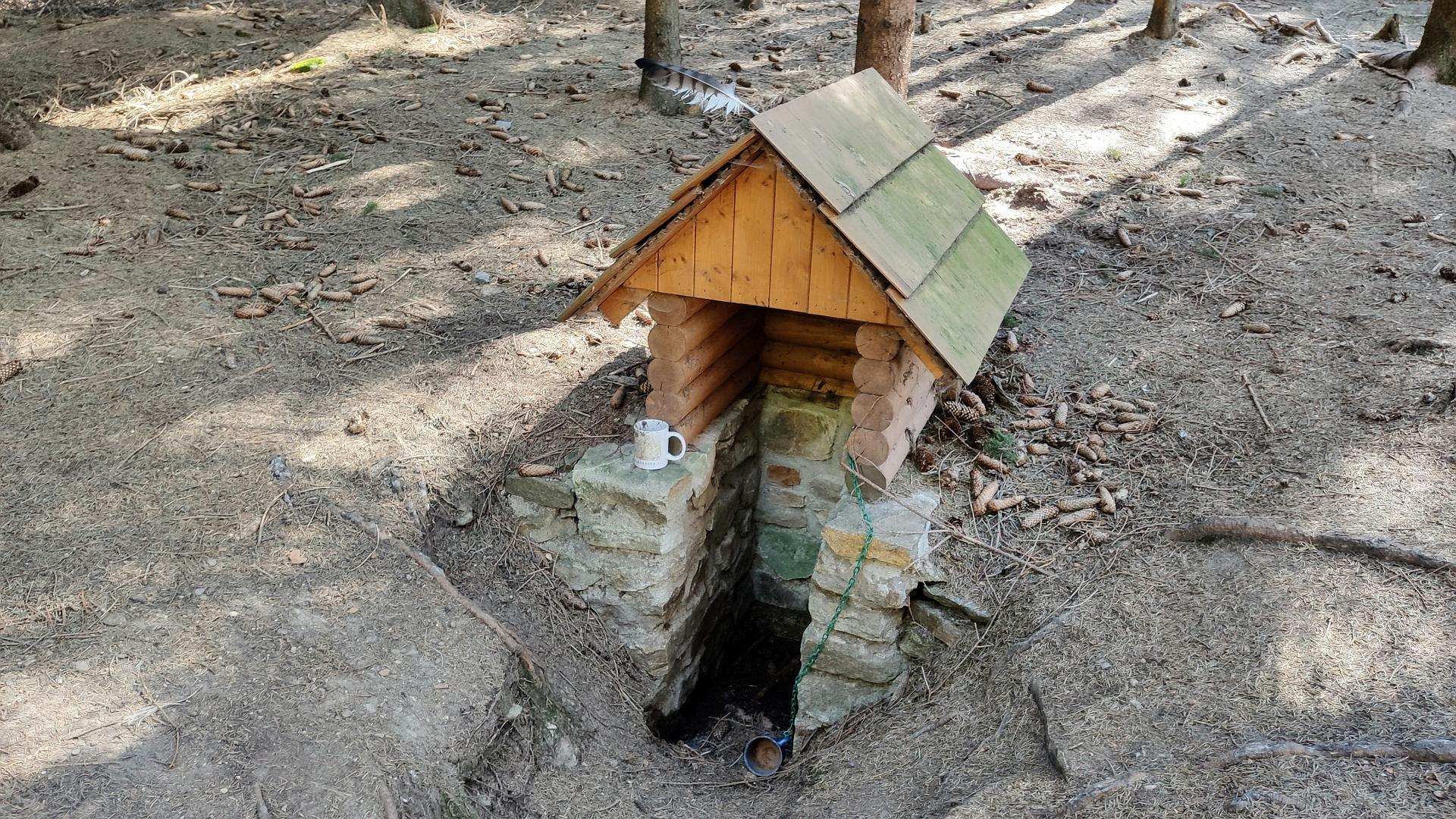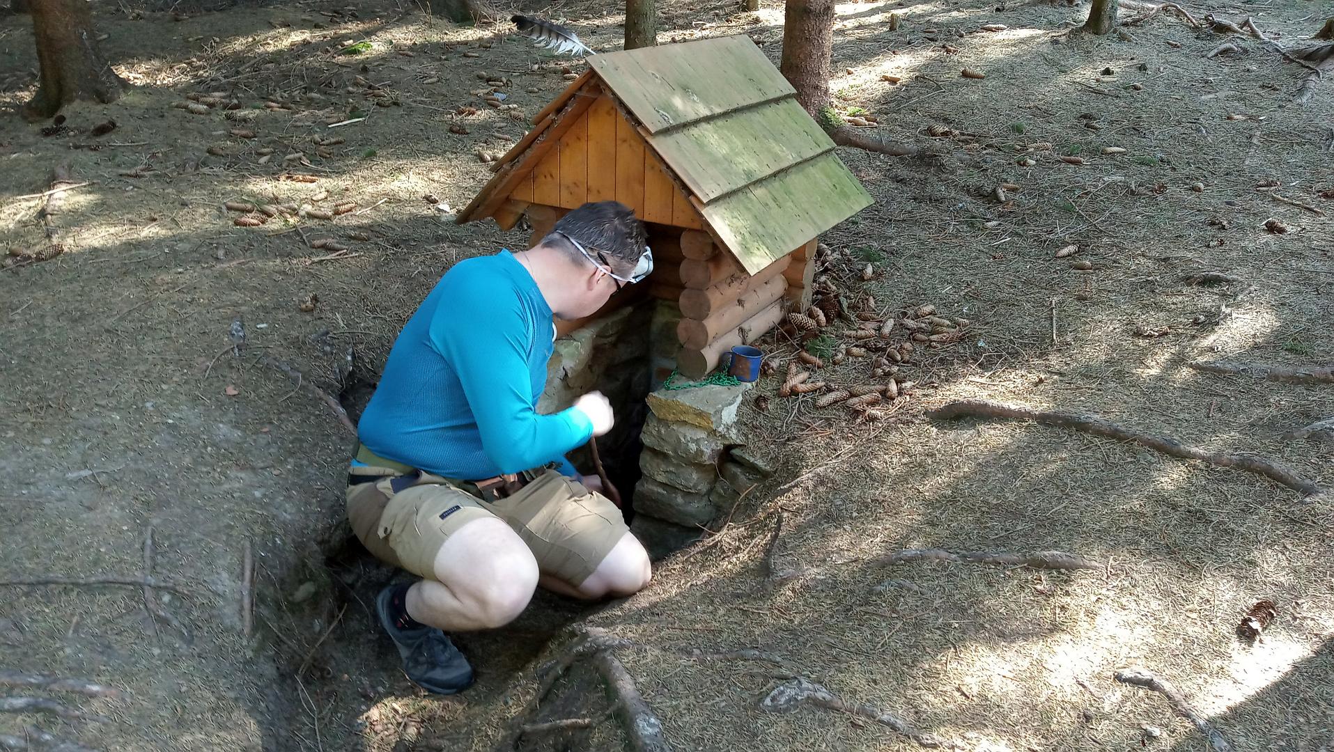 Auto jsme nechali na okraji Dolní Rožínky na parkovišti u zatopeného lomu. Cestu tam jsme zvolili po silnici směřující na Dolní Rozsíčku. Provoz byl na silnici minimální. Těsně před horizontem jsme ze silnice uhnuli doleva na lesní cestu a po chvíli došli k ruině kaple Jivina i studánce V Jivině. U kaple jsme chvíli pobyli – je tam i malé ohniště – a odlovili kešku GC4MWT9 - Zřícenina v lese Jivině - Dolní Rožínka – víceméně náhodou, protože Hance padlo oko na geoskrýš.