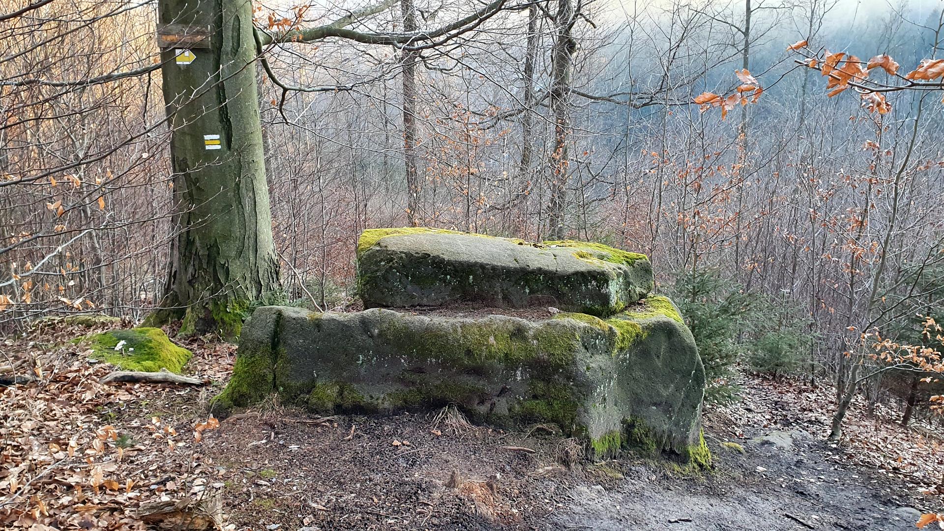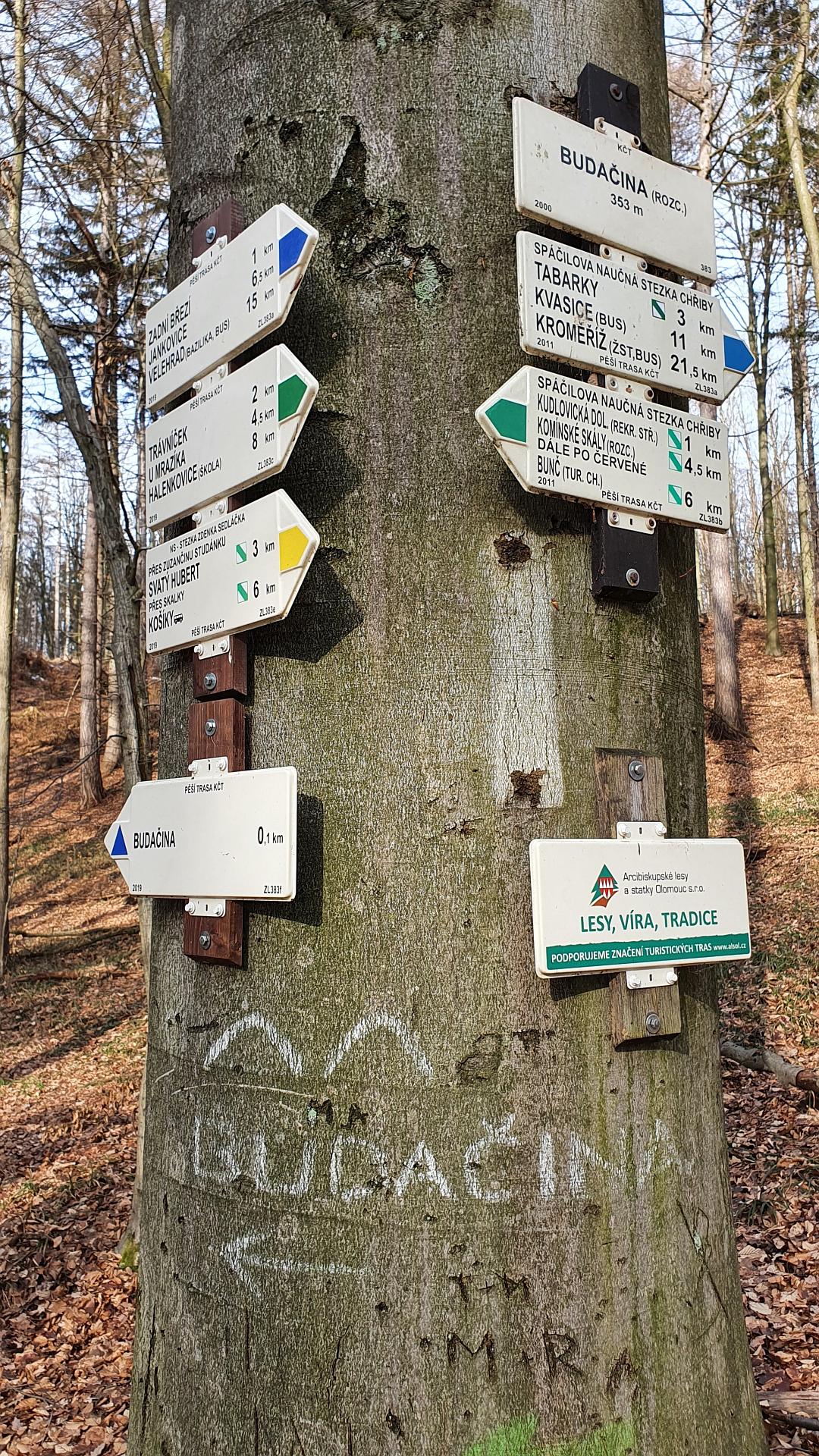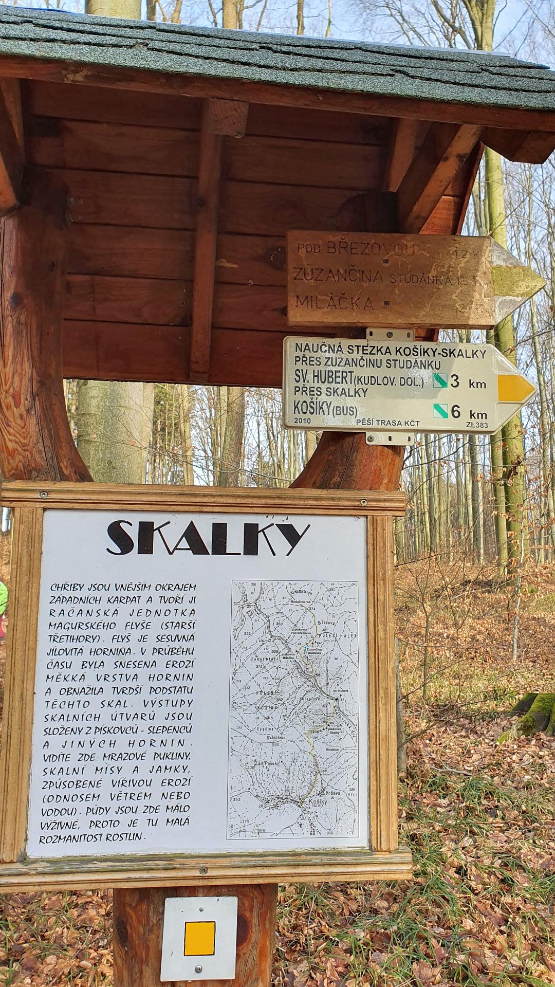 Odtud jsme po lesní silničce klesali až k Trvajově studánce, kde jsme se napojili na zelenou a na hřebeni žlutou turistickou značku a vystoupali až na kopec Březová. No a následovalo závěrečné klesání zpět do Kudlovické doliny – kolem skalního města s pěkným tábořištěm, Zuzančiny studánky se stejnojmennou geocache GC2HCCE a skalního útvaru Miláčka dolů k silnici, po které jsme se vrátili zpět do výchozího bodu výletu.