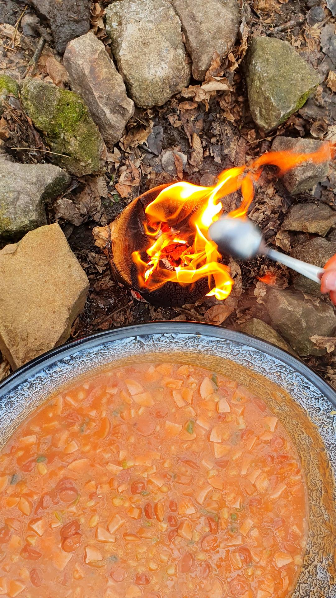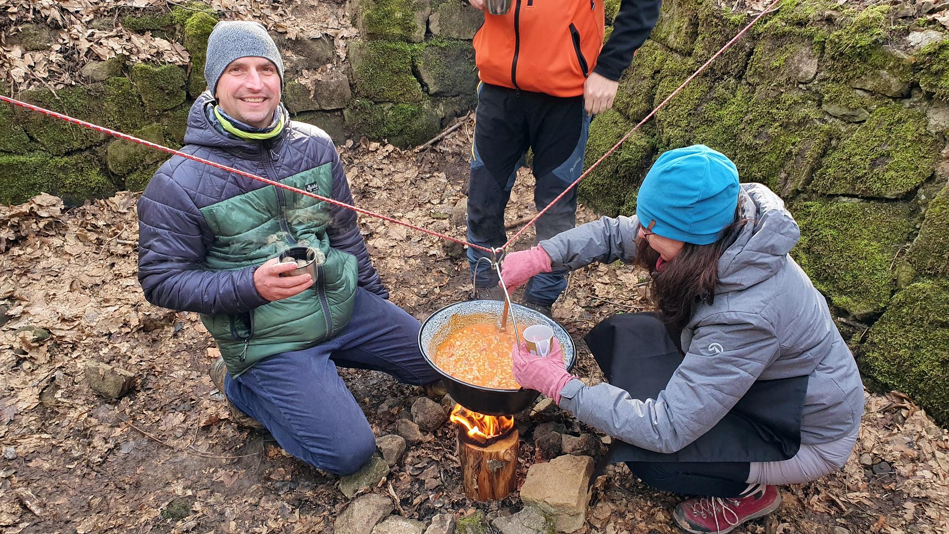 - Sraz byl až v 10:30, takže reálná příprava oběda začala kolem jedenácté a na dvanáctou bylo hotovo a i svařák byl vypitý.