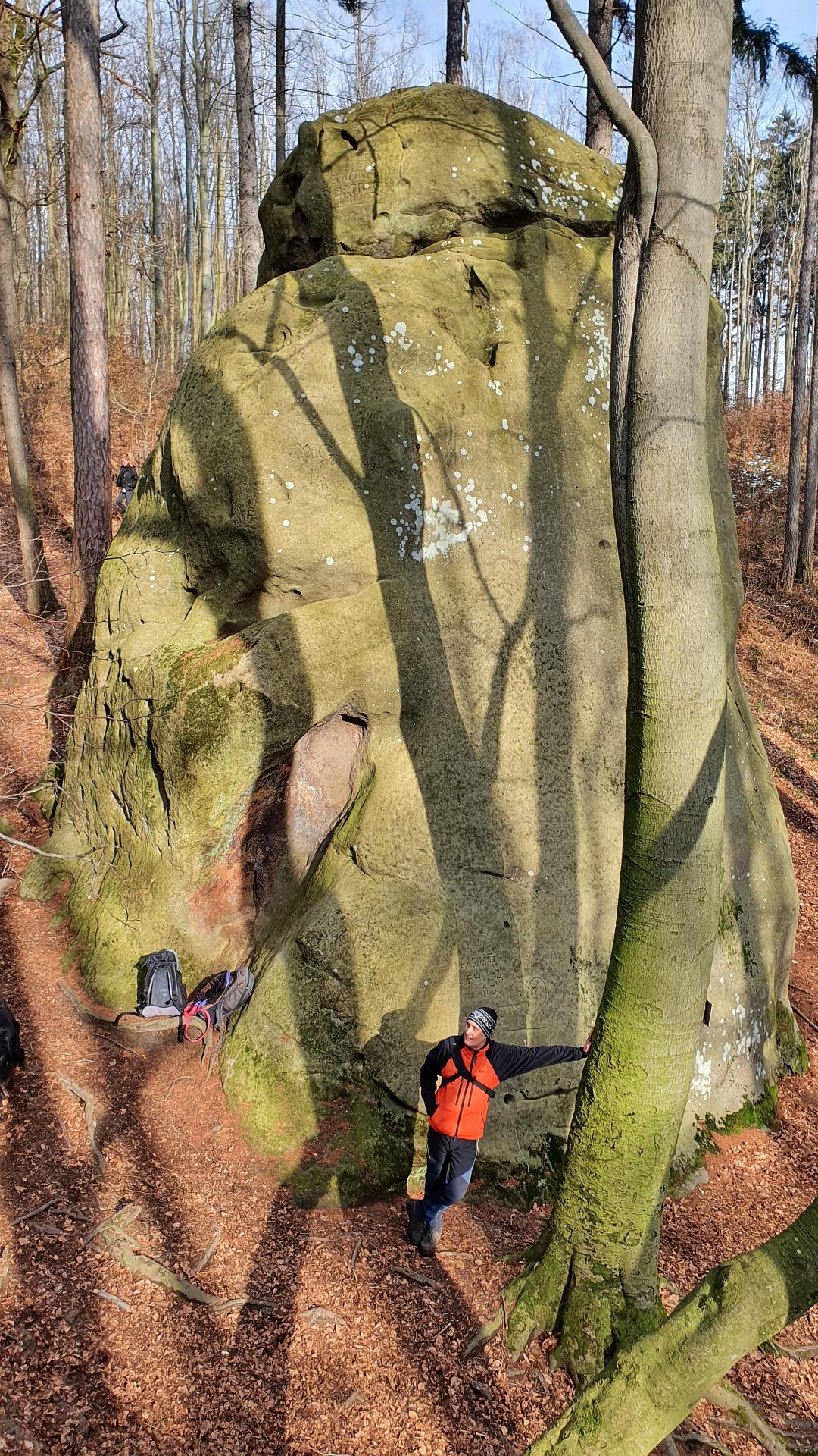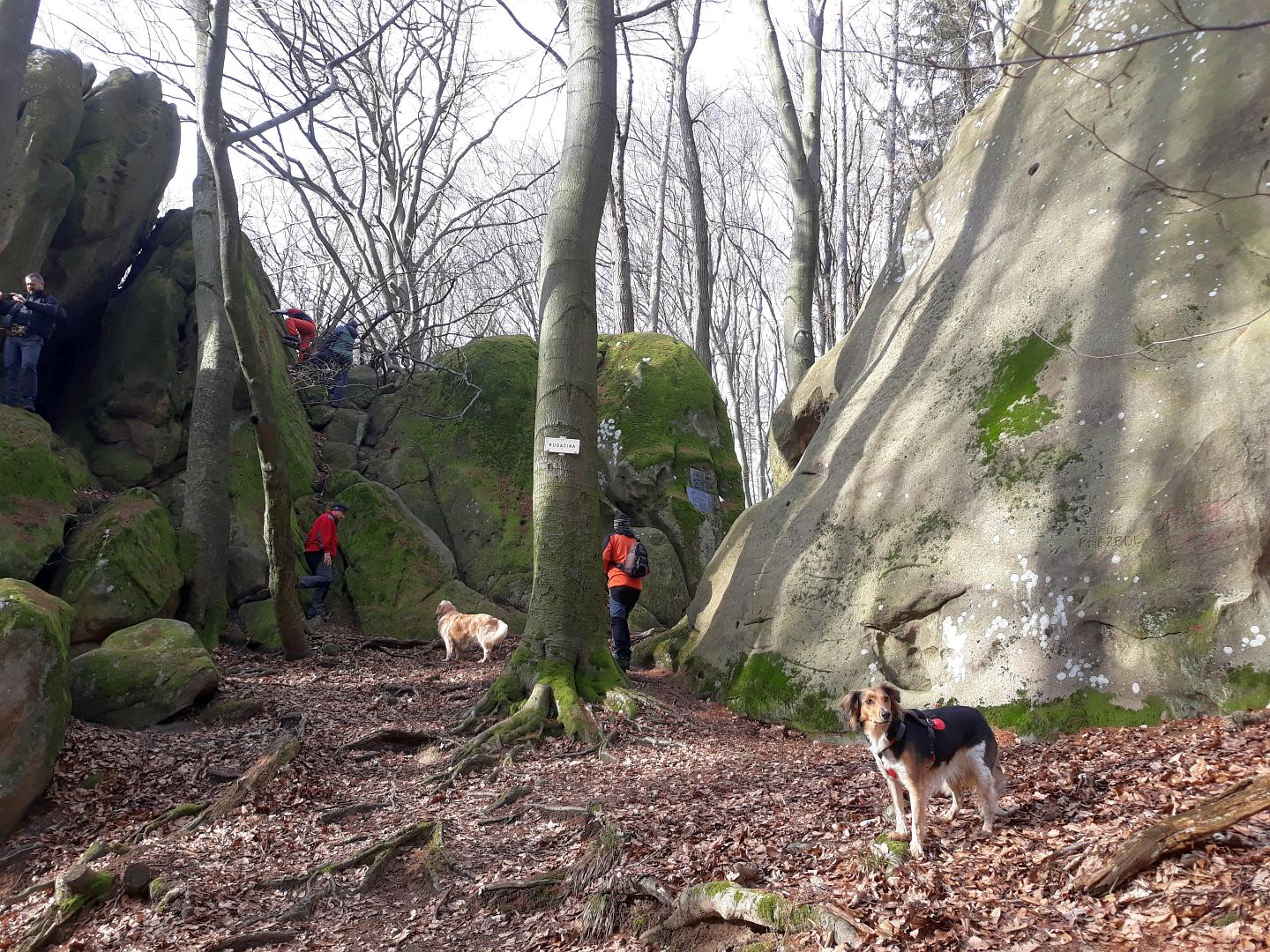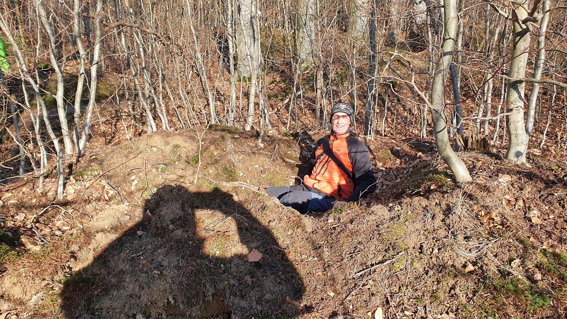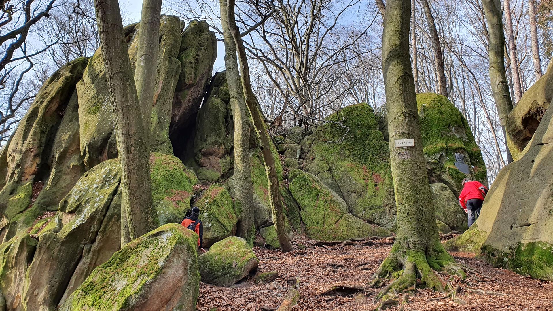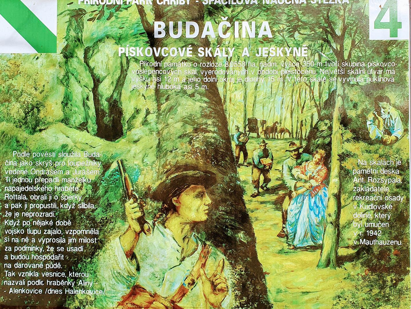 Po obědě jsme vyrazili po zelené turistické ke skálám zvaným Budačina, kde jsme chvíli okouněli, šplhali po skalách a vlezli i do jeskyně, kde podle pověsti přebývali místní loupežníci Ondráš s Jurášem. Místní kešku GC1CFA7 – Anton Špelec, ostrostřelec jsme minuli. Poté jsme pokračovali po modré turistické značce k samotě Tabarky, kde jsme navštívili místní Mohylové pohřebiště: