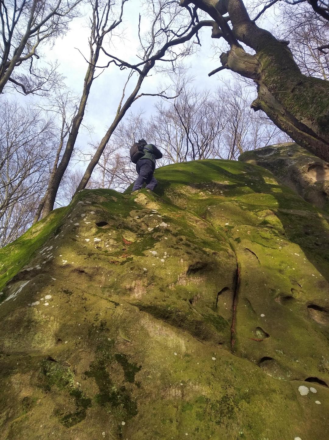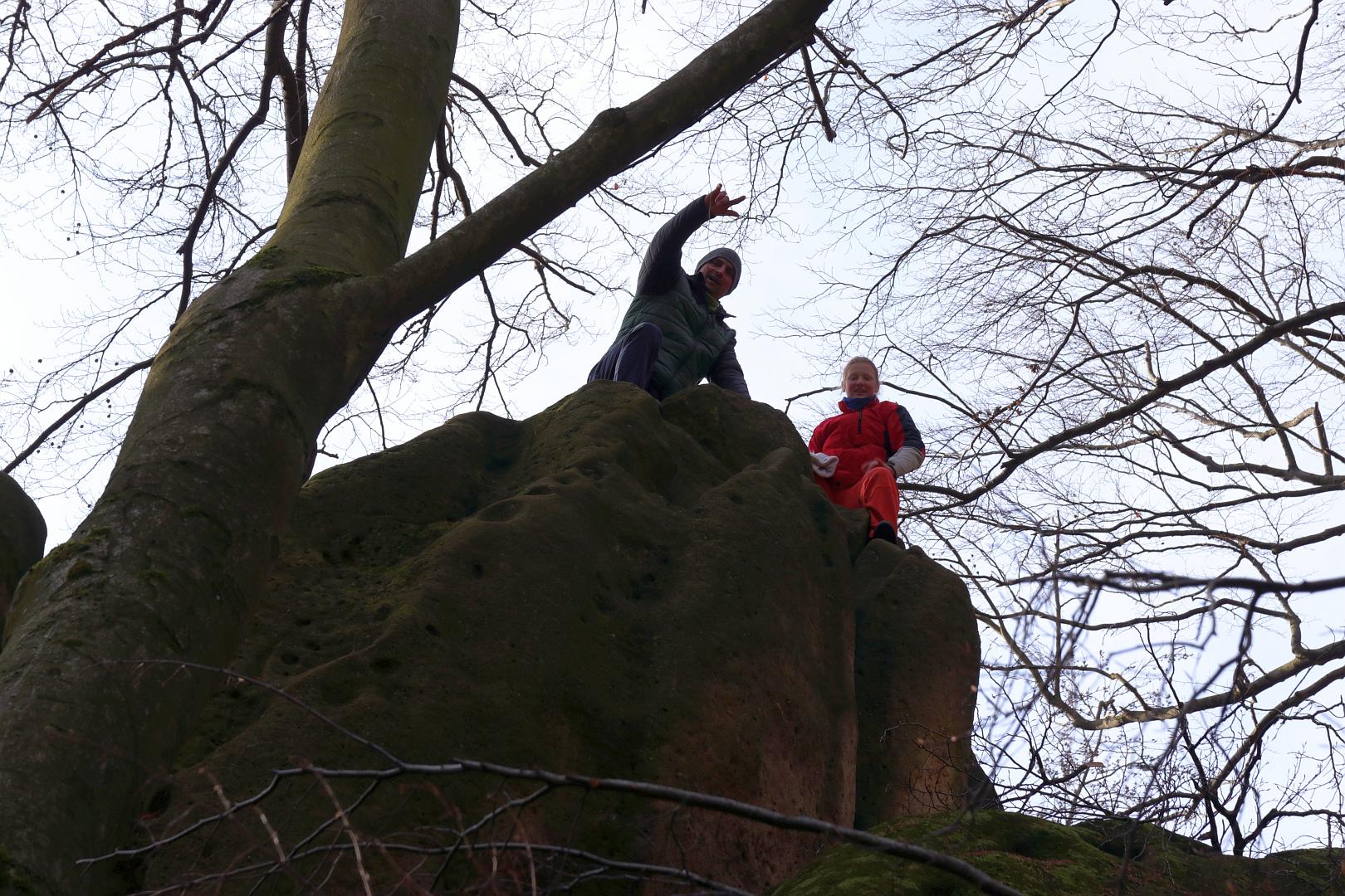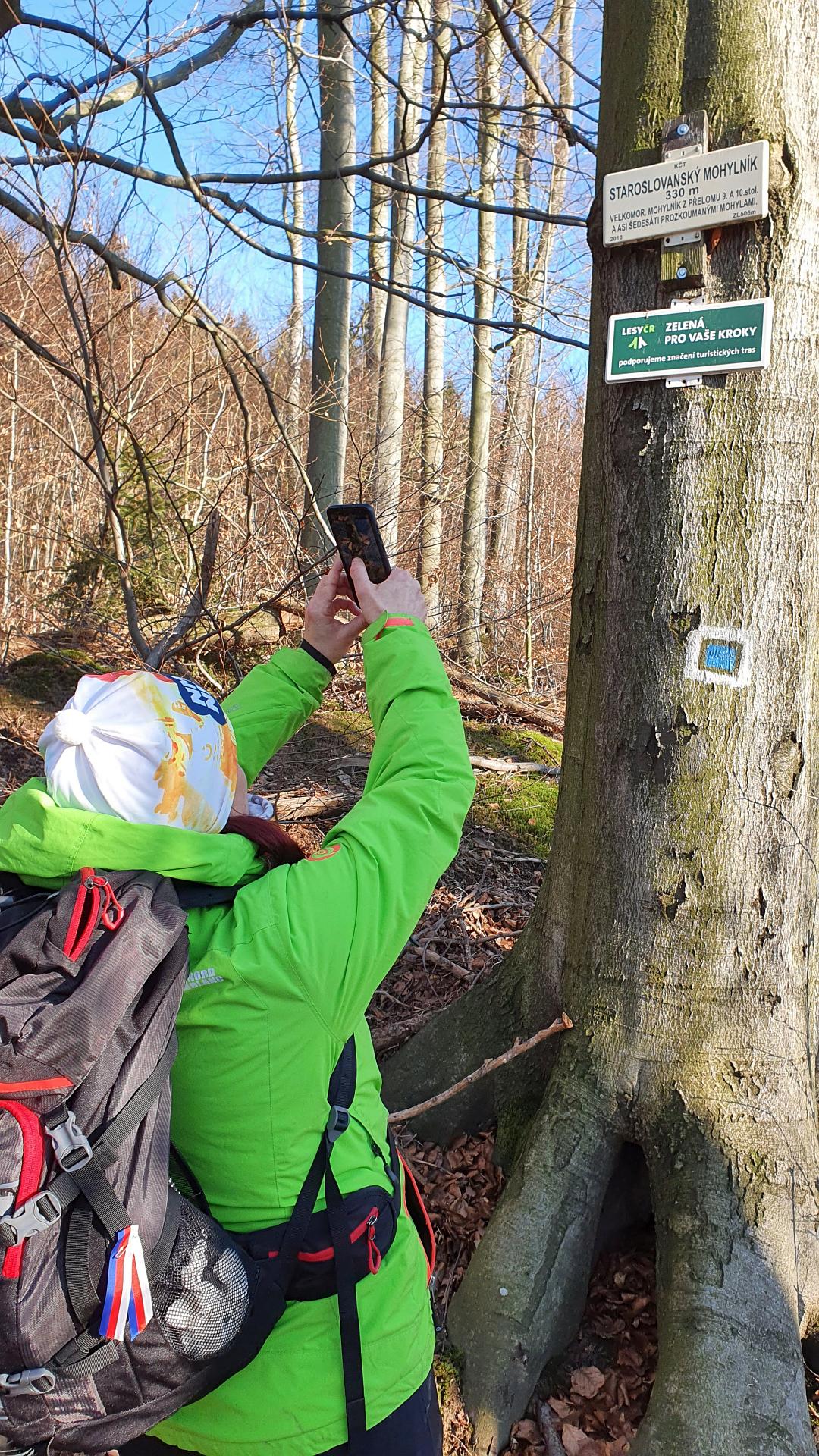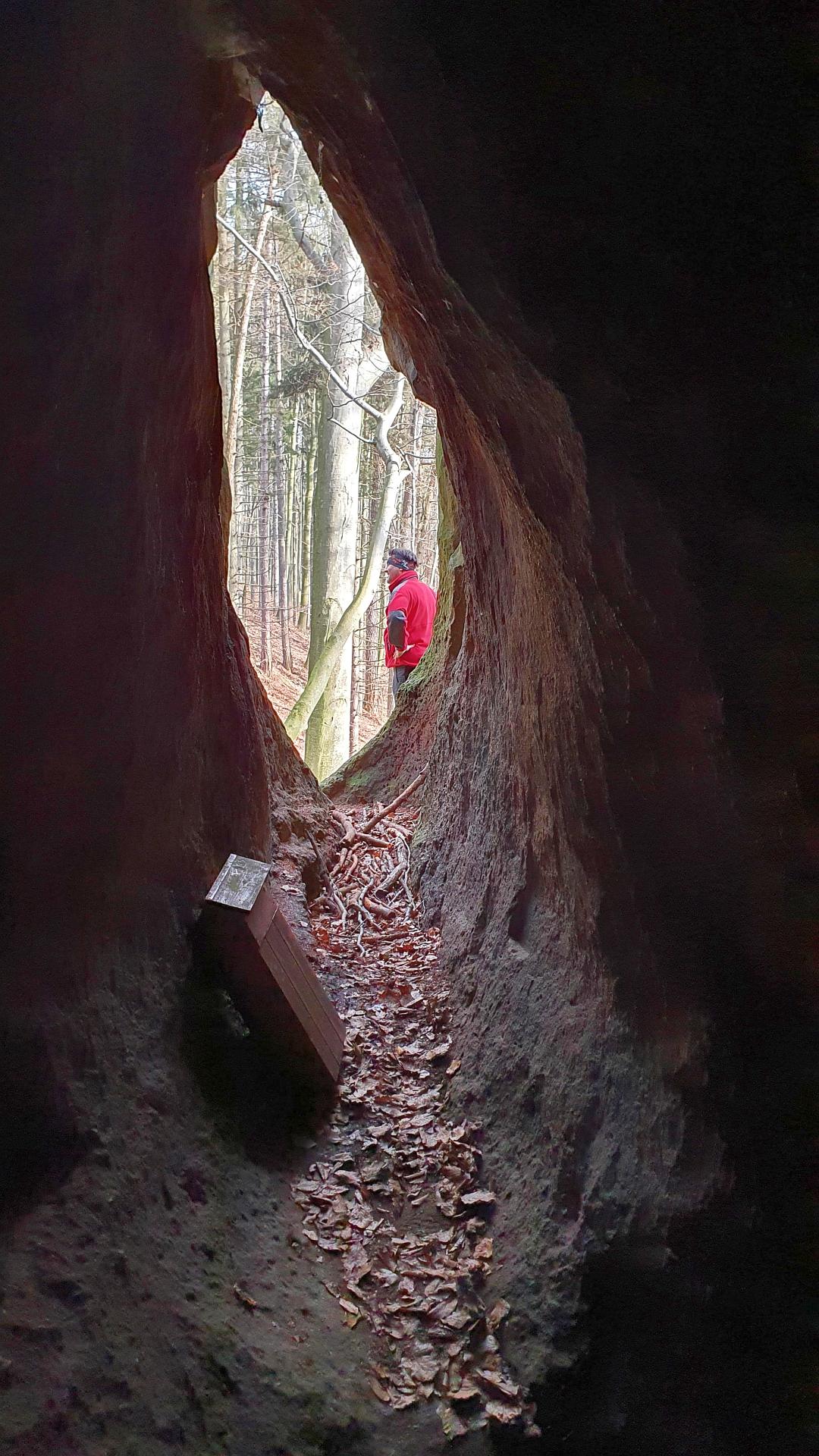 Po obědě jsme vyrazili po zelené turistické ke skálám zvaným Budačina, kde jsme chvíli okouněli, šplhali po skalách a vlezli i do jeskyně, kde podle pověsti přebývali místní loupežníci Ondráš s Jurášem. Místní kešku GC1CFA7 – Anton Špelec, ostrostřelec jsme minuli. Poté jsme pokračovali po modré turistické značce k samotě Tabarky, kde jsme navštívili místní Mohylové pohřebiště: