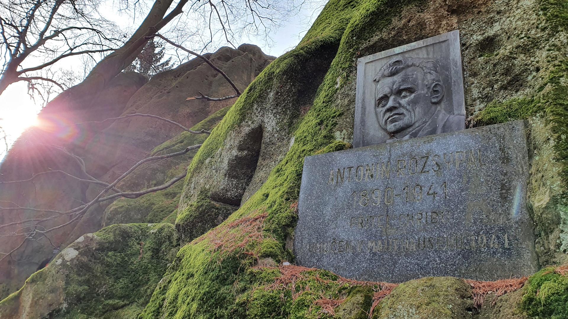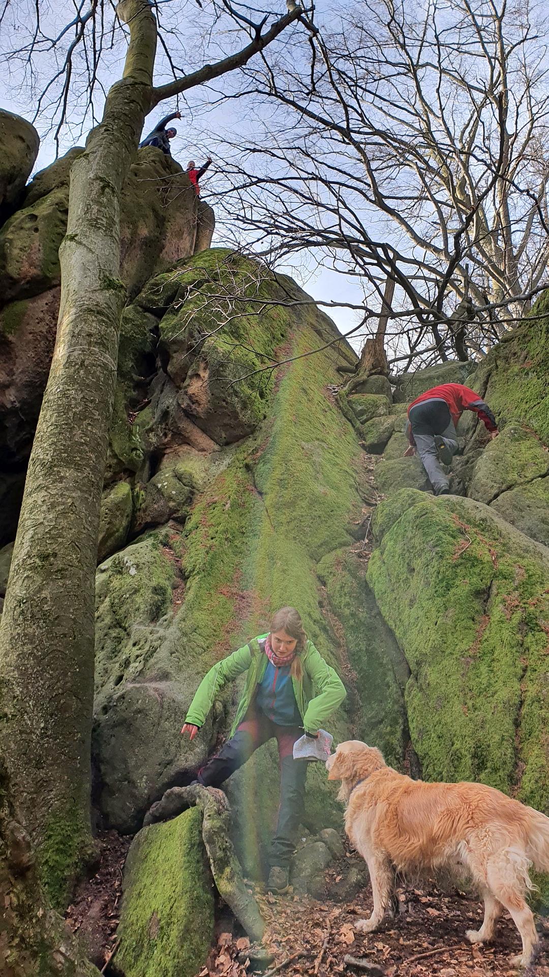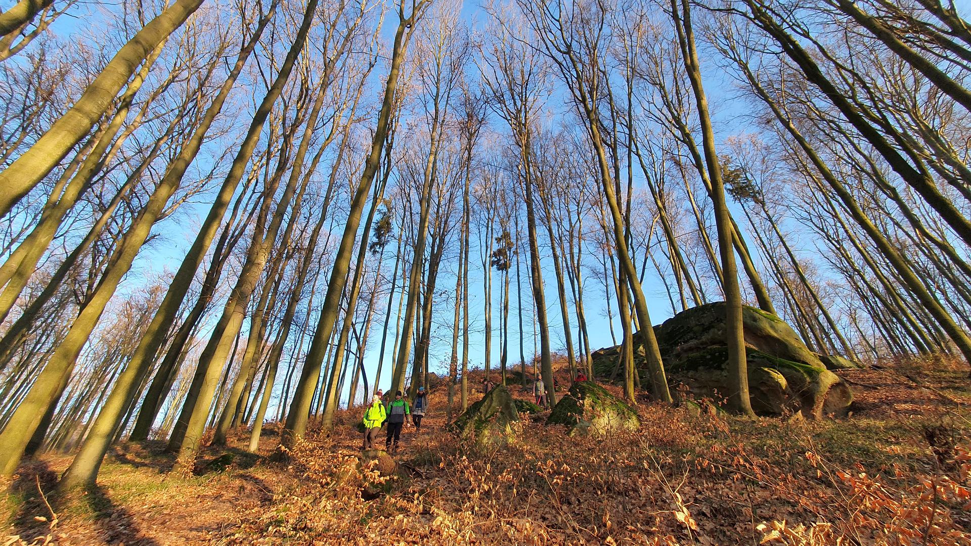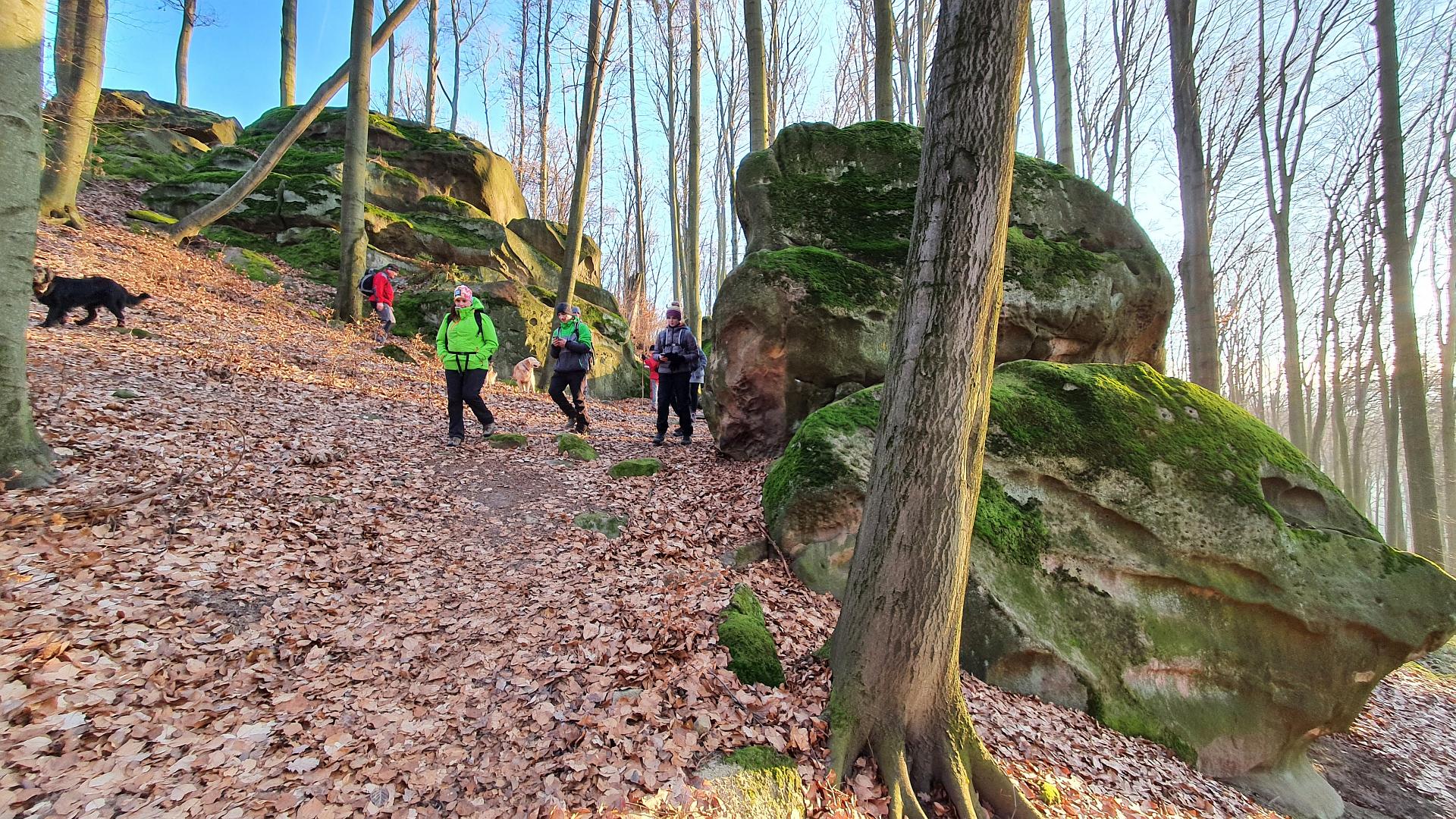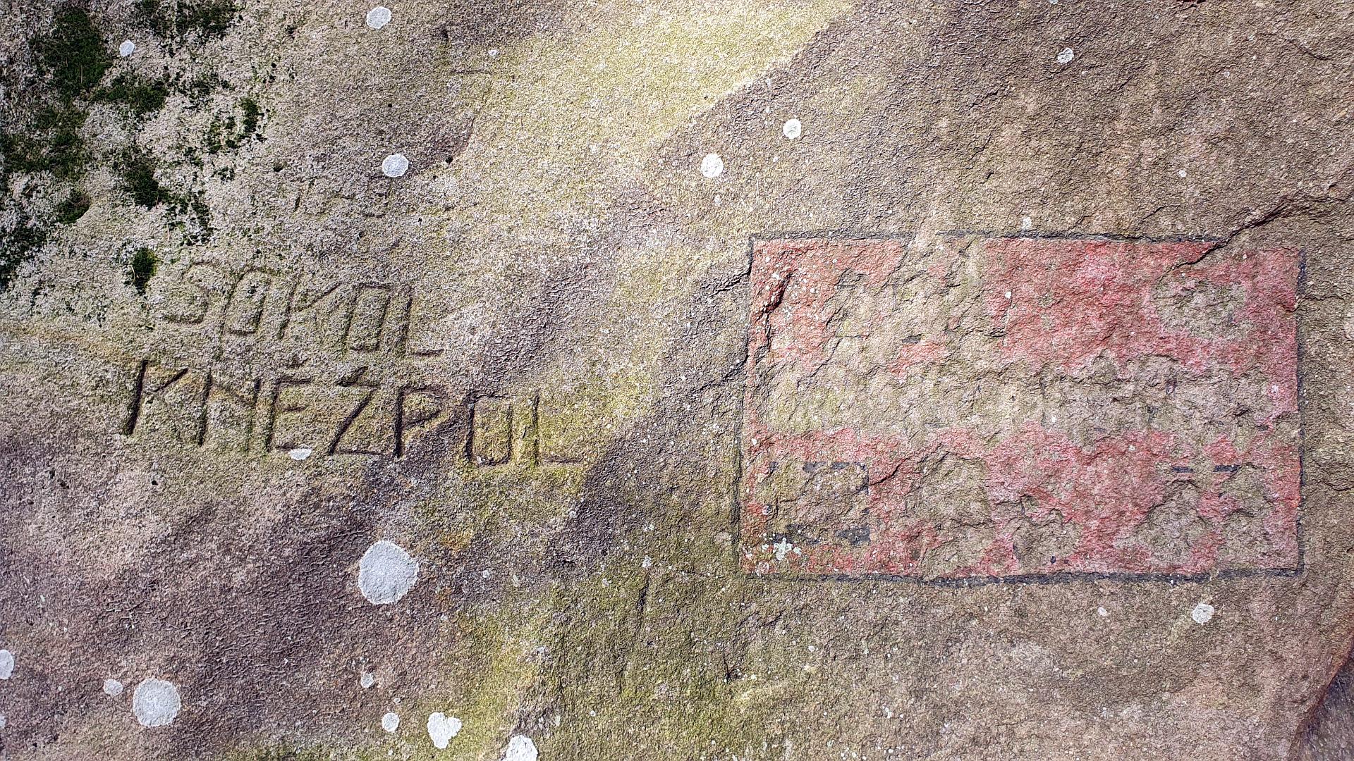 Po obědě jsme vyrazili po zelené turistické ke skálám zvaným Budačina, kde jsme chvíli okouněli, šplhali po skalách a vlezli i do jeskyně, kde podle pověsti přebývali místní loupežníci Ondráš s Jurášem. Místní kešku GC1CFA7 – Anton Špelec, ostrostřelec jsme minuli. Poté jsme pokračovali po modré turistické značce k samotě Tabarky, kde jsme navštívili místní Mohylové pohřebiště: