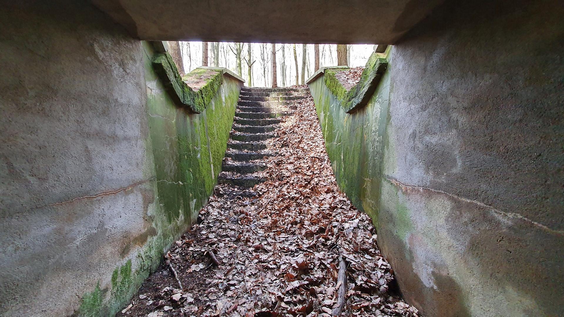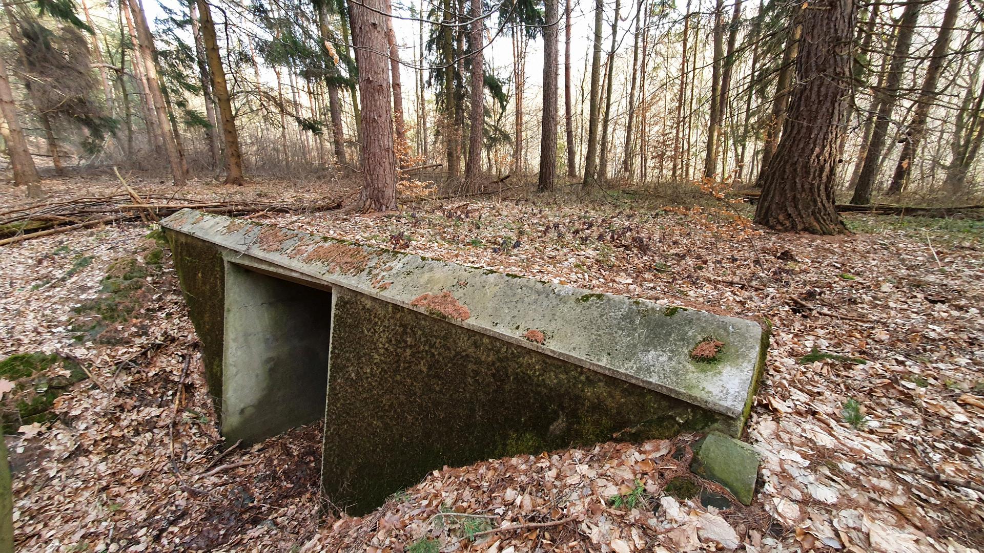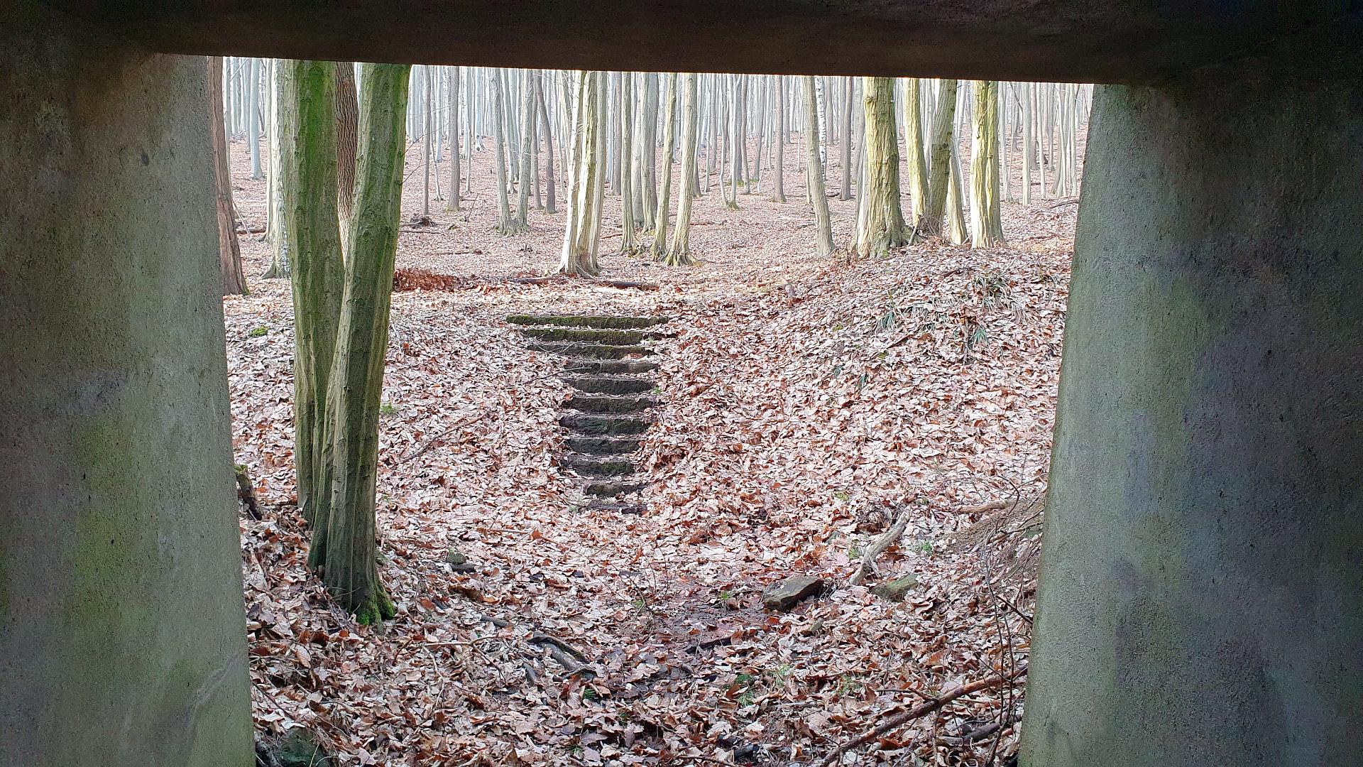 Koukneme se na poněkud zanedbaný Památník padlých hrdinů a jdeme kolem dálničního mostu vedoucího odnikud nikam odlovit geokešku GC2FX8J Lesní podchod. Prostě si představte les, v něm na jednom místě vybetonovaný vstup se schody pod zem a o 25 metrů dál výlez. Pod pár stromy. Jeden vede alespoň pod lesní cestou, druhý ani to ne! Měla tu vést dálnice původně navržená Janem Antonínem Baťou, pro kterou všechny ty mosty, podchody a propustky stihli vybetonovat, ale na vlastní dálnici už nedošlo. Nejdřív kvůli válce, pak kvůli komunistům. A později původně projektovanou trasu nahradila dnešní D1. Zajímavé je, v jak dobrém stavu neudržovaný beton i po 80 letech stále je.