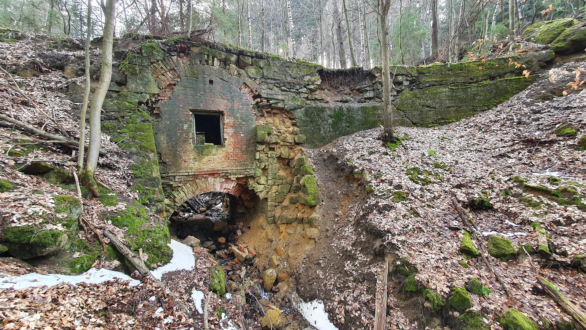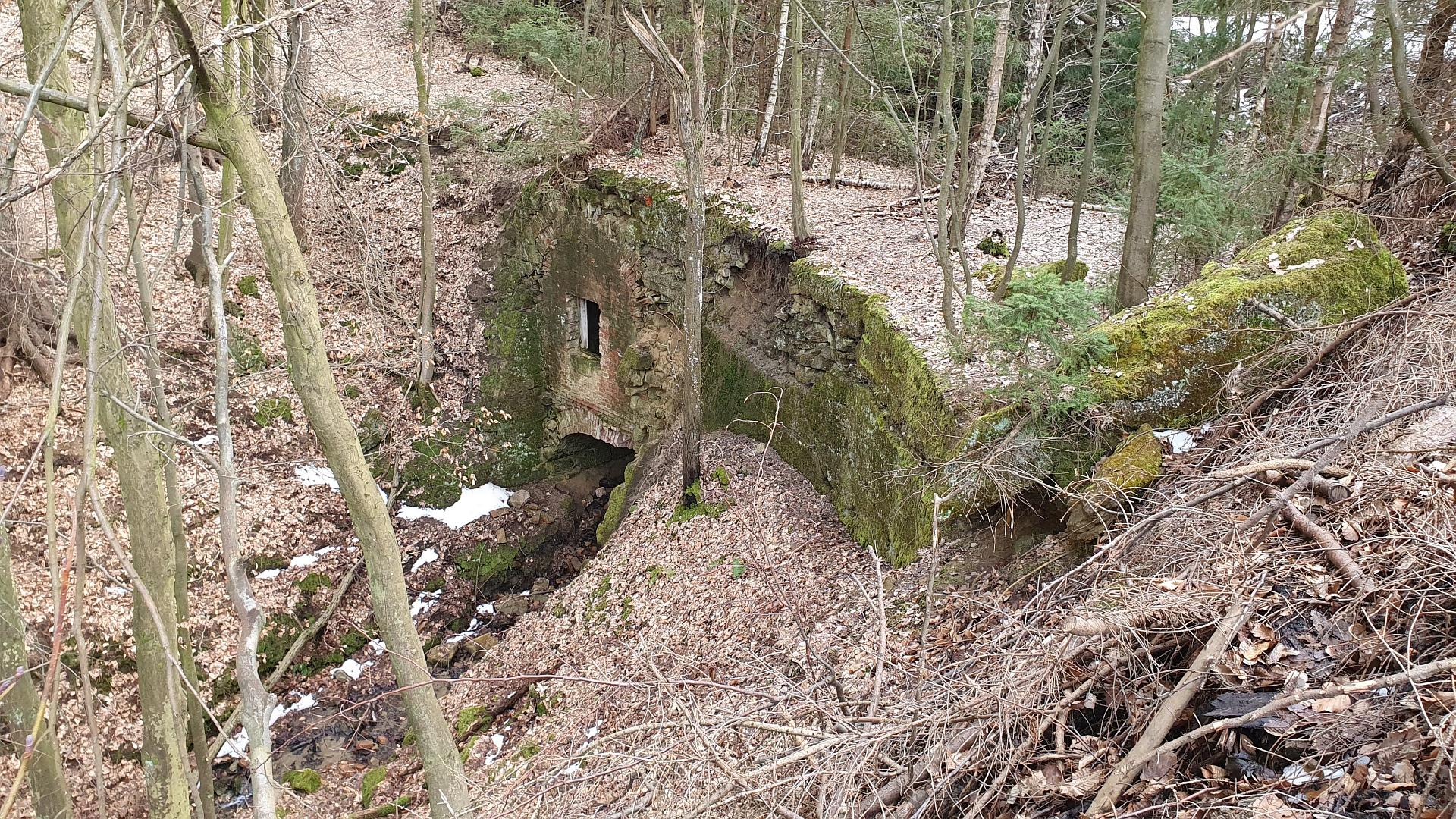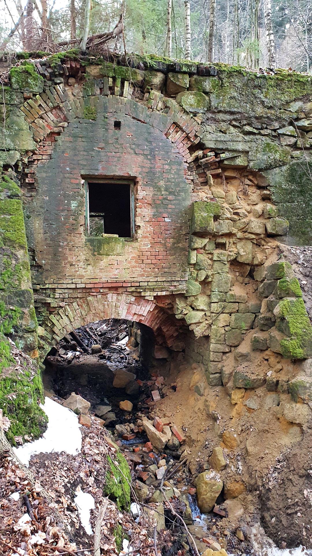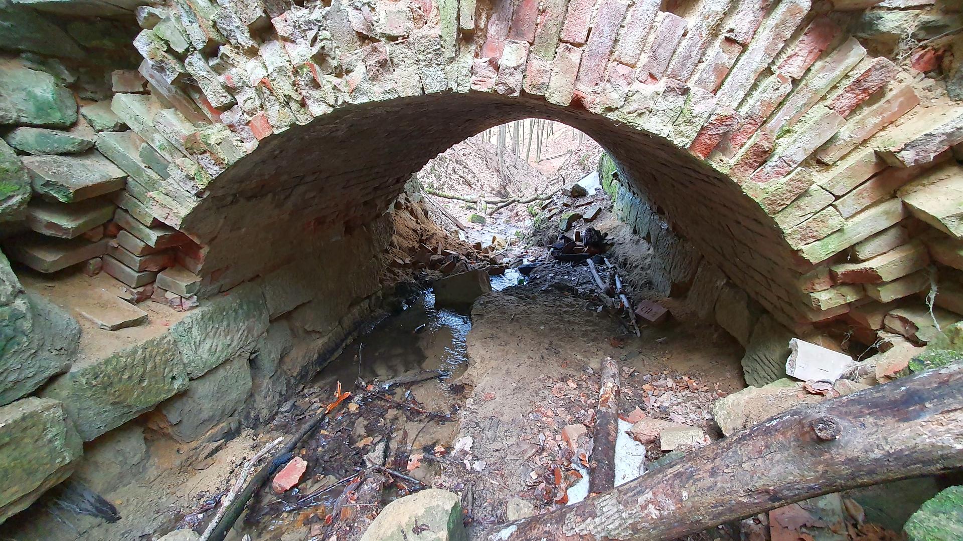 Po necelých dvou kilometrech přicházíme k další zajímavosti – ke Staré cihelce. Je to vlastně taková low-costová chřibská varianta slavného Ponte Vecchio – obytného mostu. Nepodařilo se mi s jistotou najít původ podivné stavby, některé zdroje tvrdí, že šlo o celnici nebo luxusní myslivecký posed, jiné, že šlo o úkryt pro lesní dělníky. Údajně ještě kolem roku 1950 byla místnost nad klenutým cihlovým mostkem vybavena nejen dveřmi a postelemi, ale i kamny. Dnes je vše v dezolátním stavu. Kvůli kluzkému terénu jsem se dovnitř neodvážil. U Staré cihelky je i keška GC2GHV1 Stará cihelka, kterou se mi ovšem najít nepodařilo.