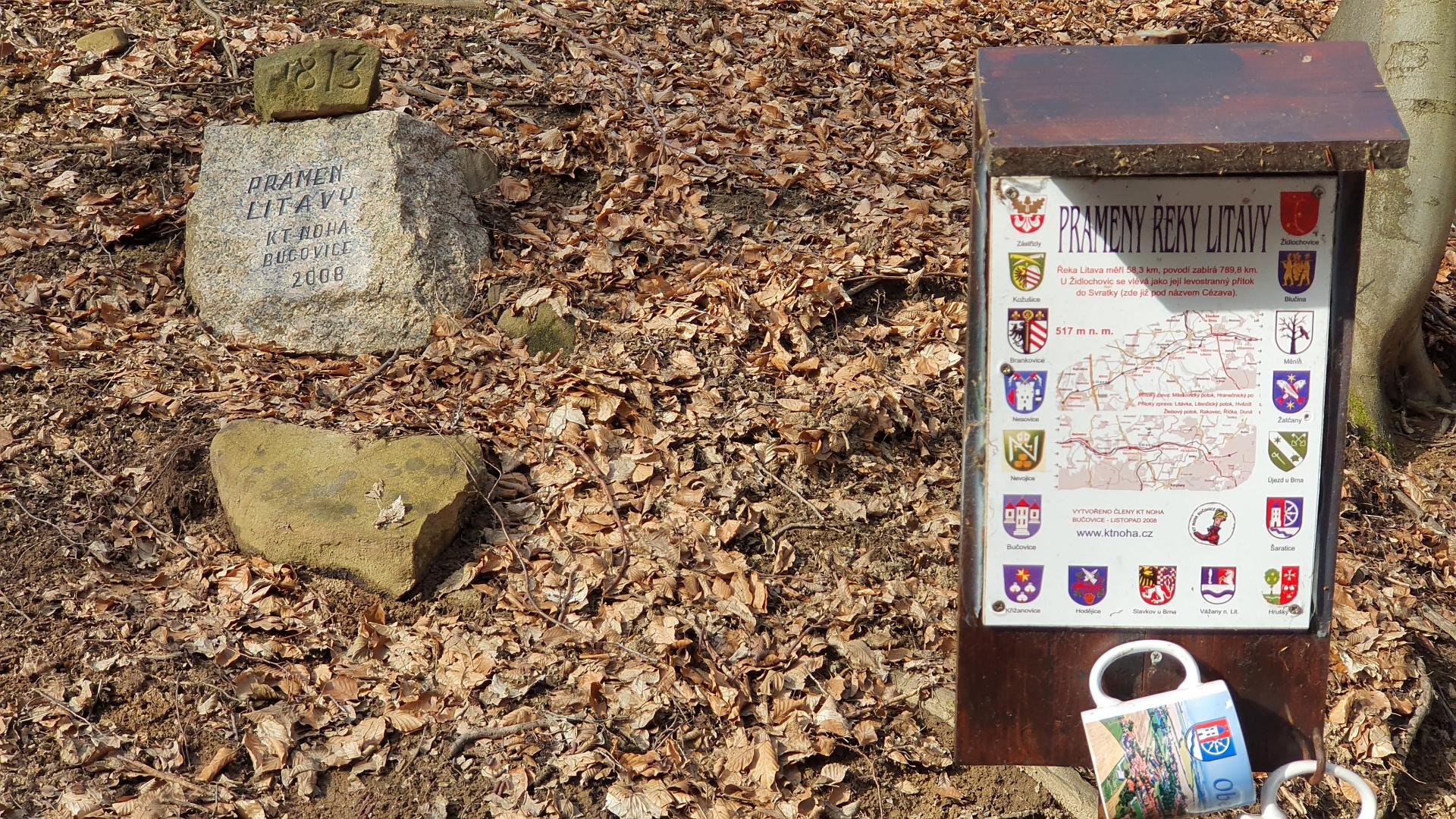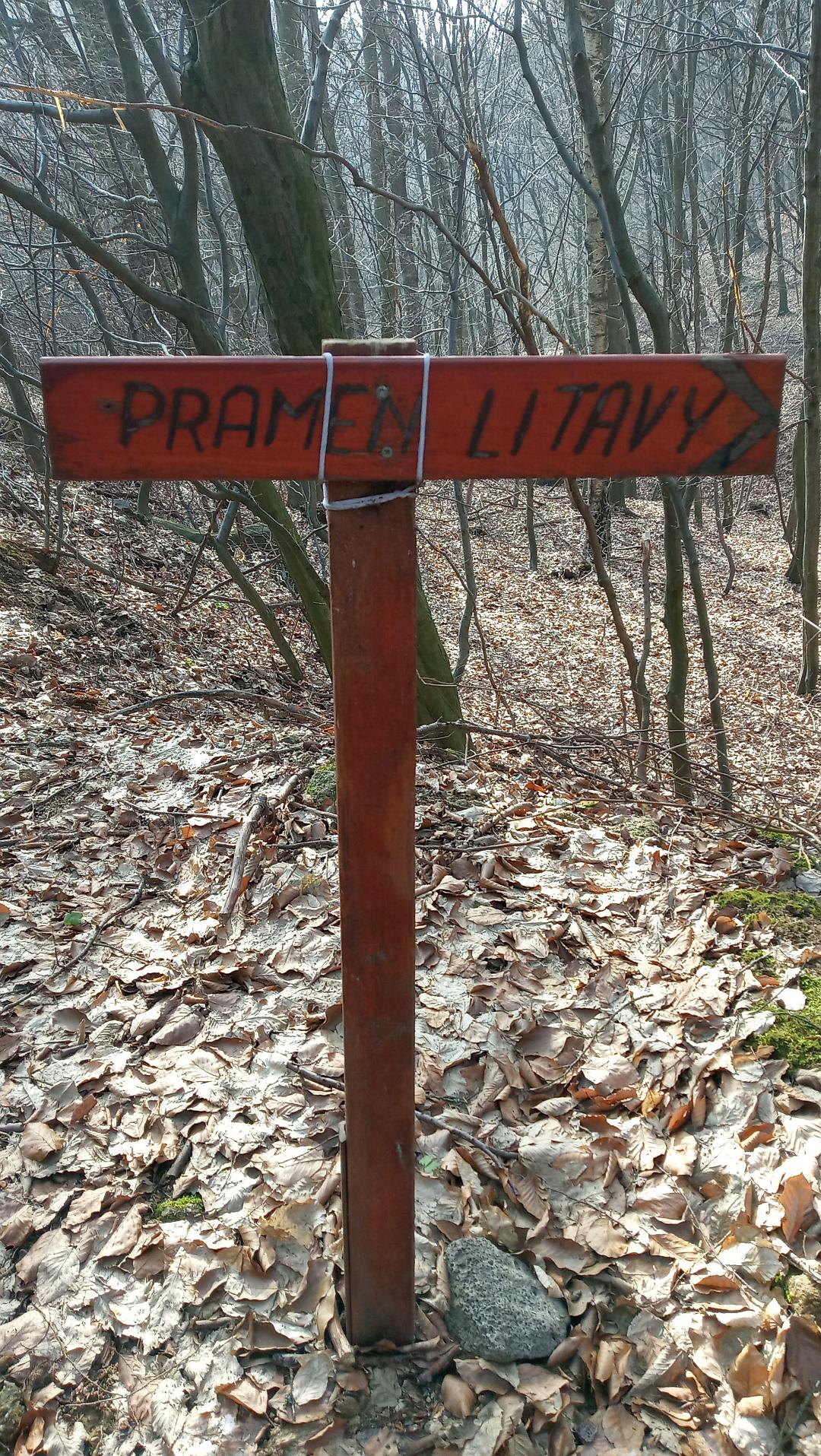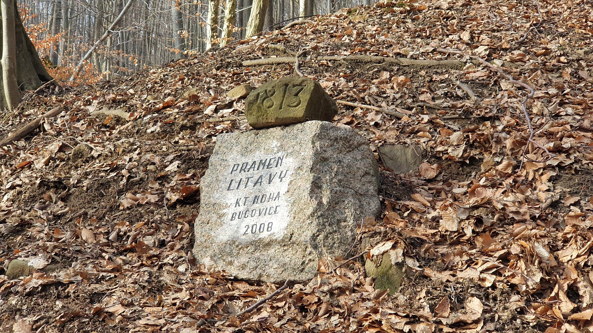 O necelý kilometr dál je kousek pod cestou pramen řeky Litavy. Přístup dolů poněkud klouzal, ale nakonec byl pokořen. Vyznačené místo pramene (boudička) je nyní suché, ale zleva i zprava obtékané bujnými potůčky. Nad boudičkou je pamětní kámen od K. T. Noha Bučovice.