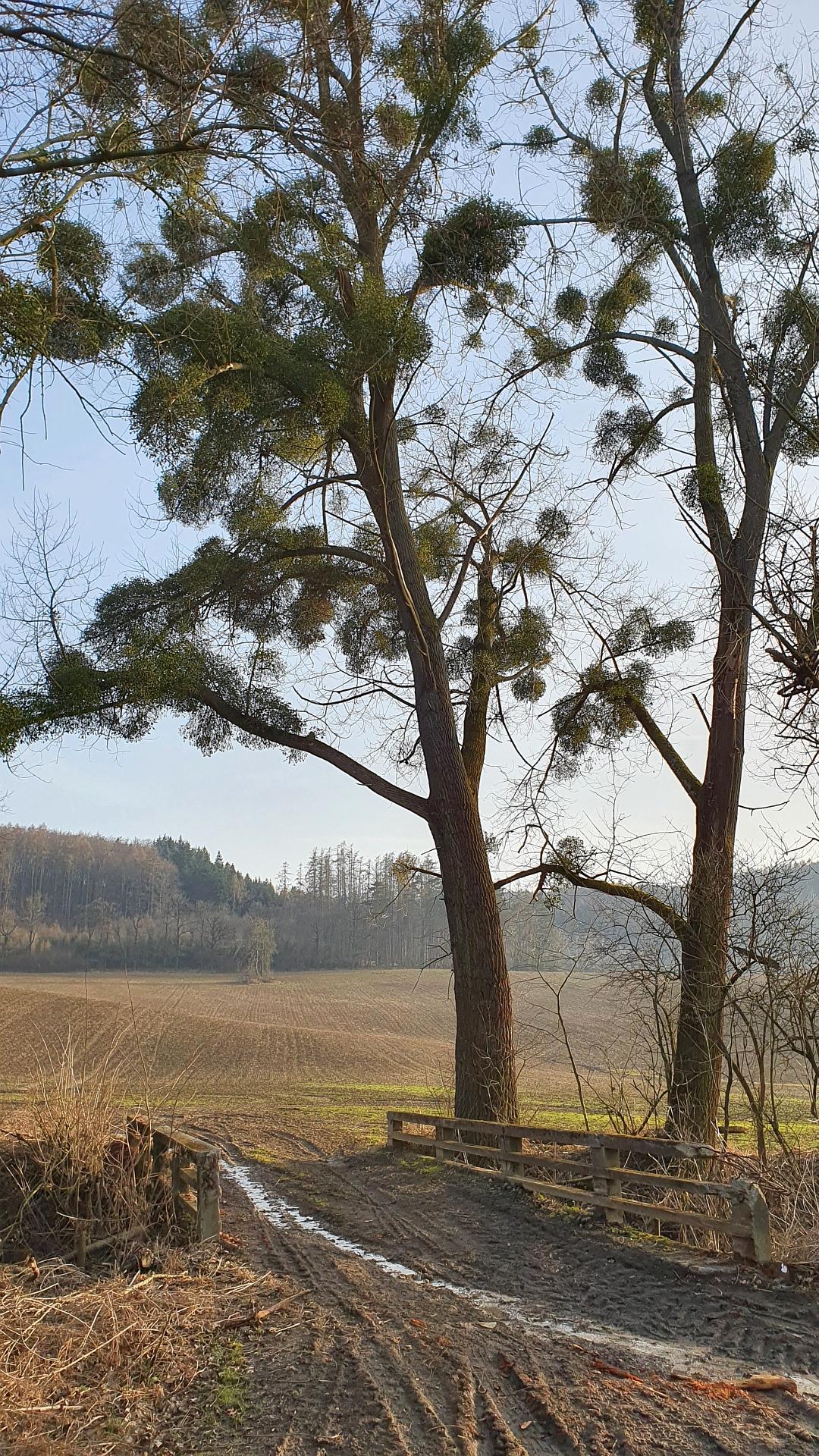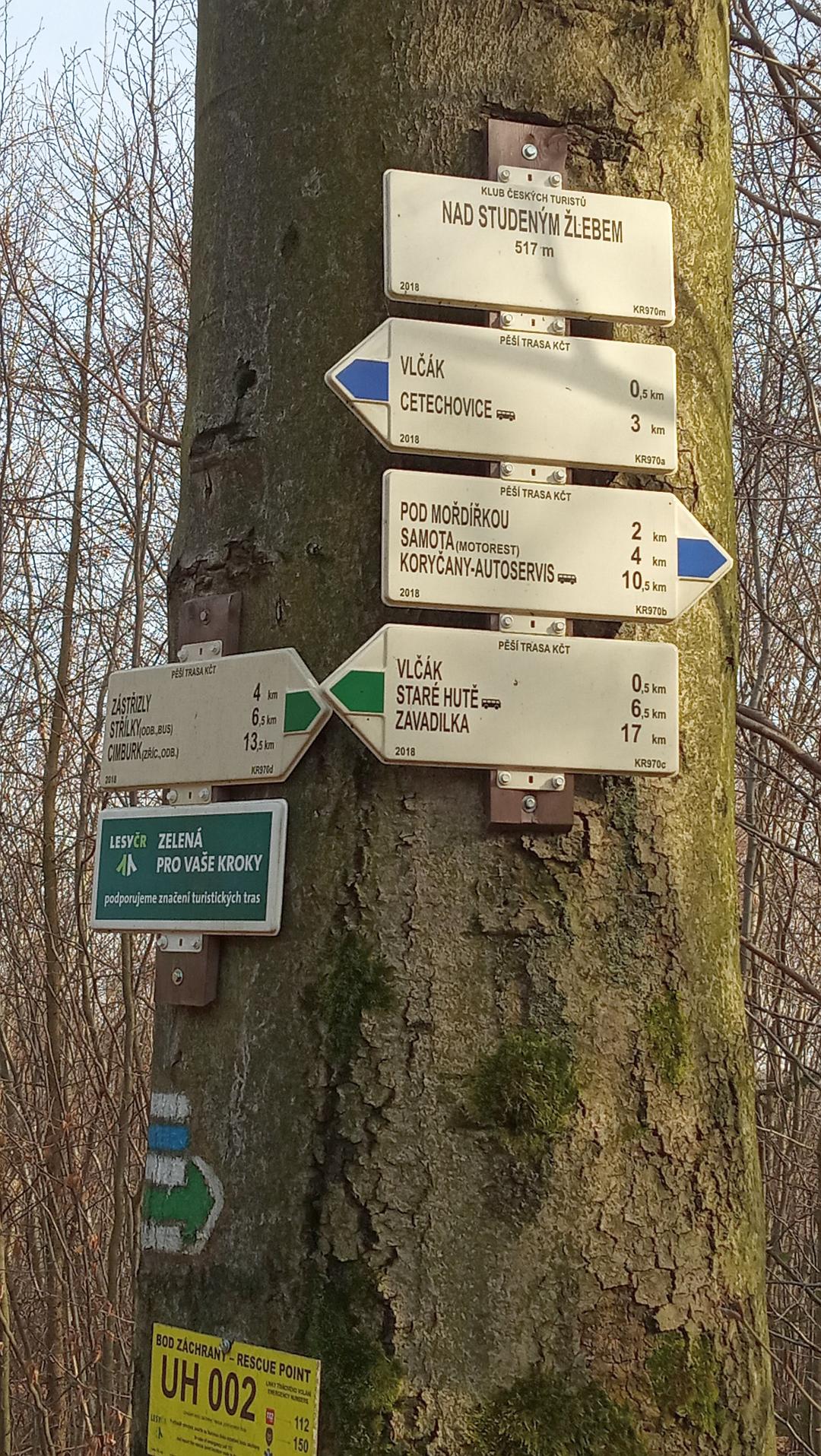 Parkujeme za obcí Zástřizly kousek před jedním ze zdejších dokončených mostů nedokončené dálnice, přímo na zelené turistické značce, kterou budeme sledovat celým Studeným žlebem až nahoru k rozcestí Nad Studeným žlebem.