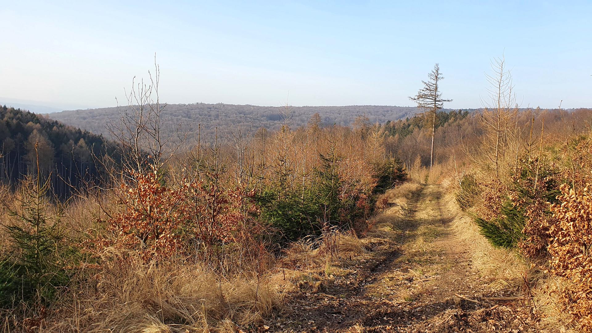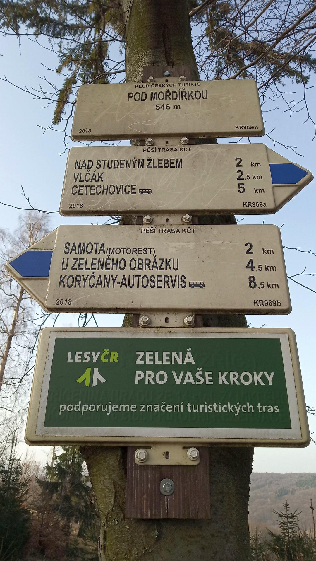 Od pramene Litavy je to už jen skok k rozcestí Nad Studeným žlebem. Kousek doleva je Vlčák, ale my se vydáváme to modré turistické značce doprava, pomalu zpět. Cestou ještě u rozcestníku Pod Mořdířkou ulovíme geocache GCVAGN Za modřínem a o pár set metrů dále odbočujeme z turistické trasy doprava a podle mapy trošku dobrodružně míříme dolů k zelené turistické značce, po které jsme šli nahoru. S trochou bahna na botách se nám to po chvíli podaří a „ocáskem“ míříme zpět k autu.
