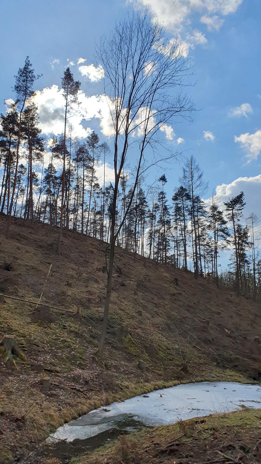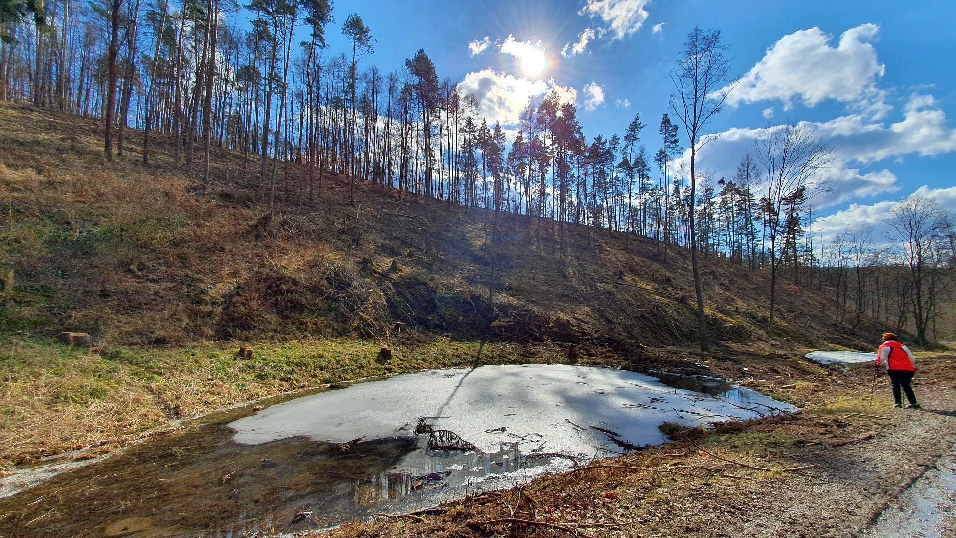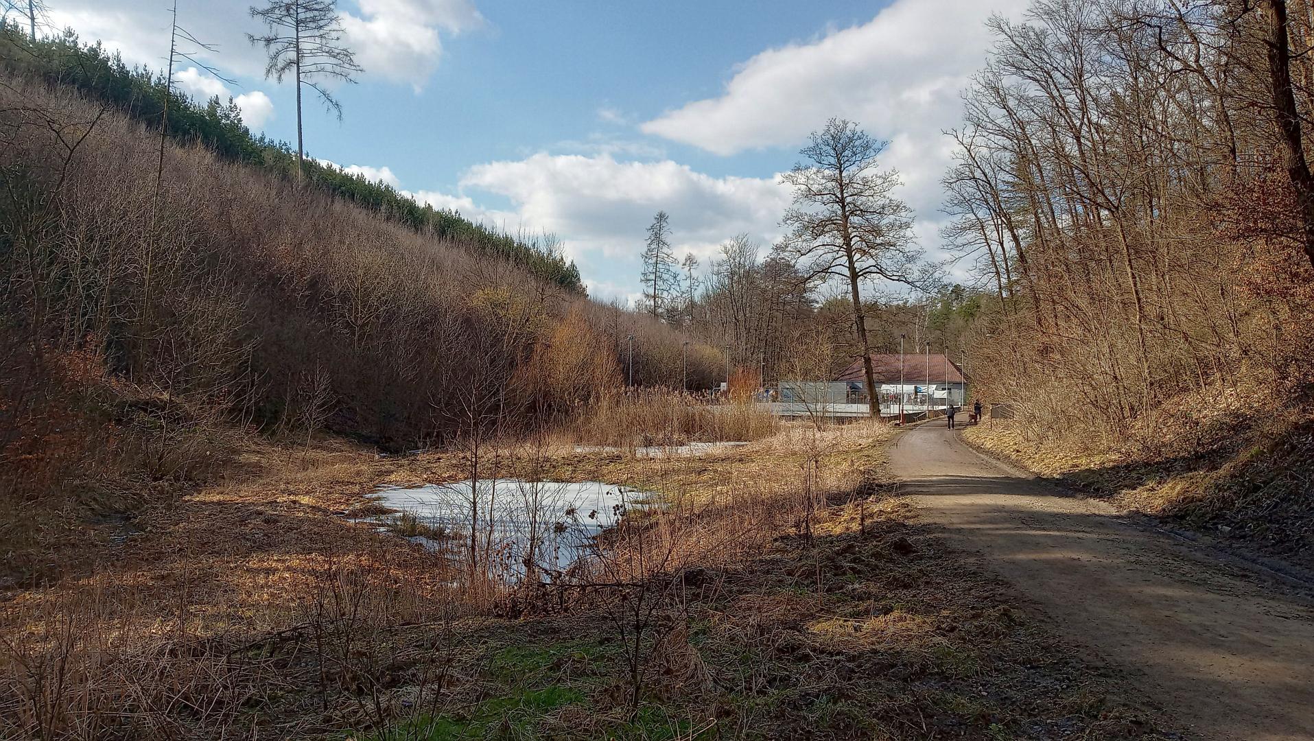 Od Hubertky jsme se vrátili zpět na modrou značku, abychom z ní hned zase odbočili doprava a dali se údolím bezejmenného potůčku zpět dolů do údolí Rakovce, které jsme dosáhli kousek nad Mokrou Horou. Zde už vede modrá turistická značka, která je trochu exponovanější (nic strašného) a po které se vracíme zpět k Sokolu Ořešín a autu.