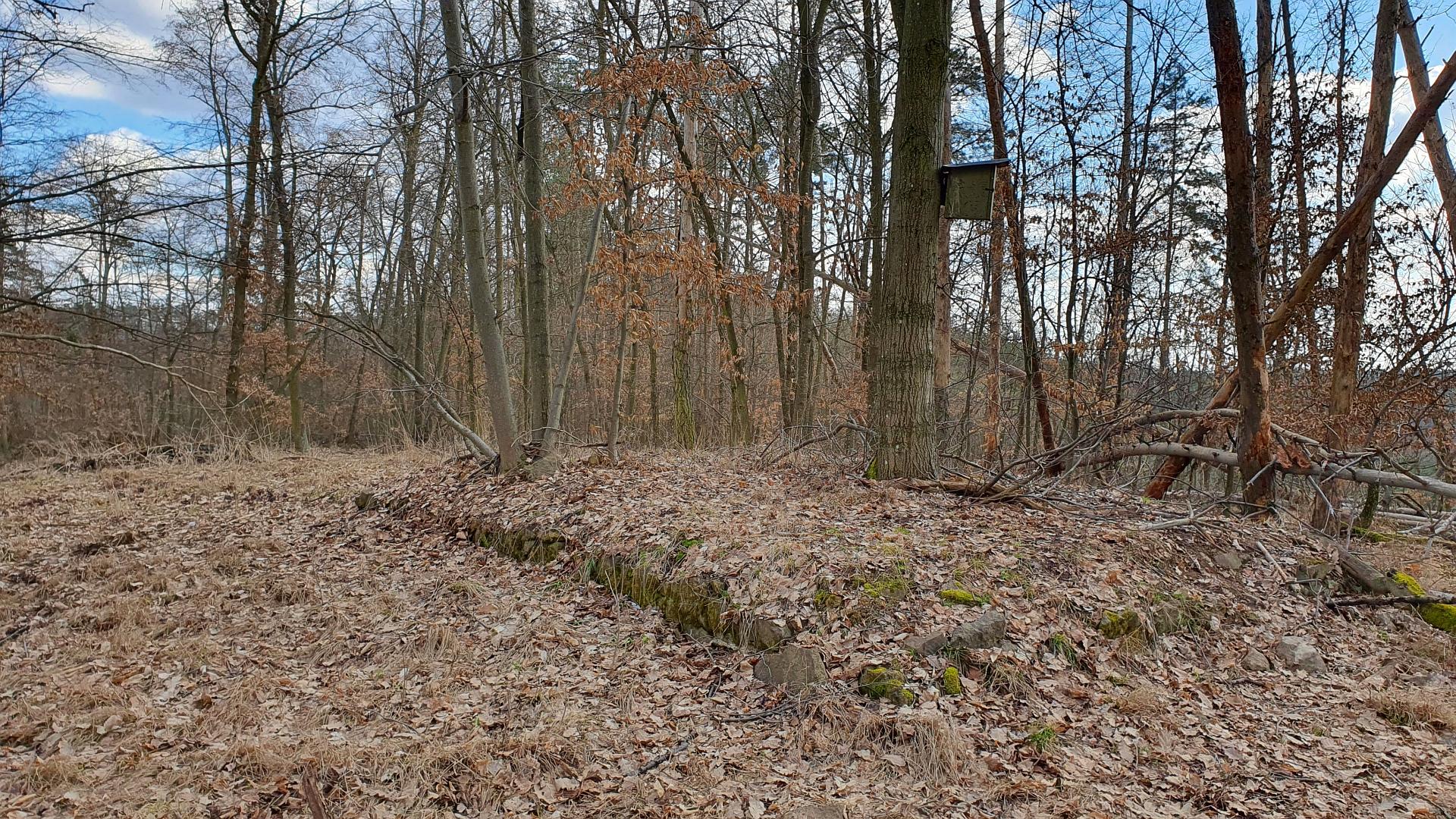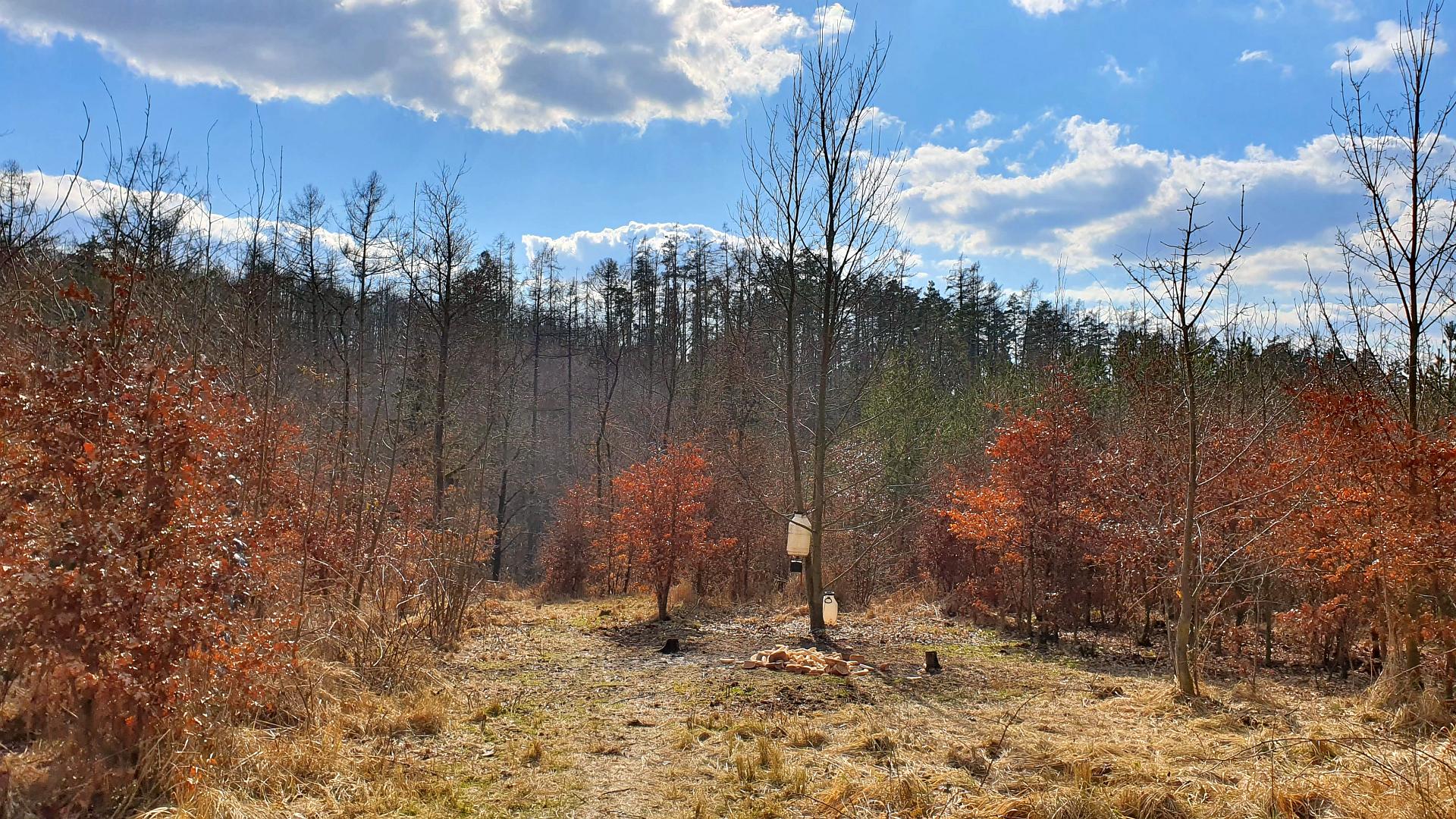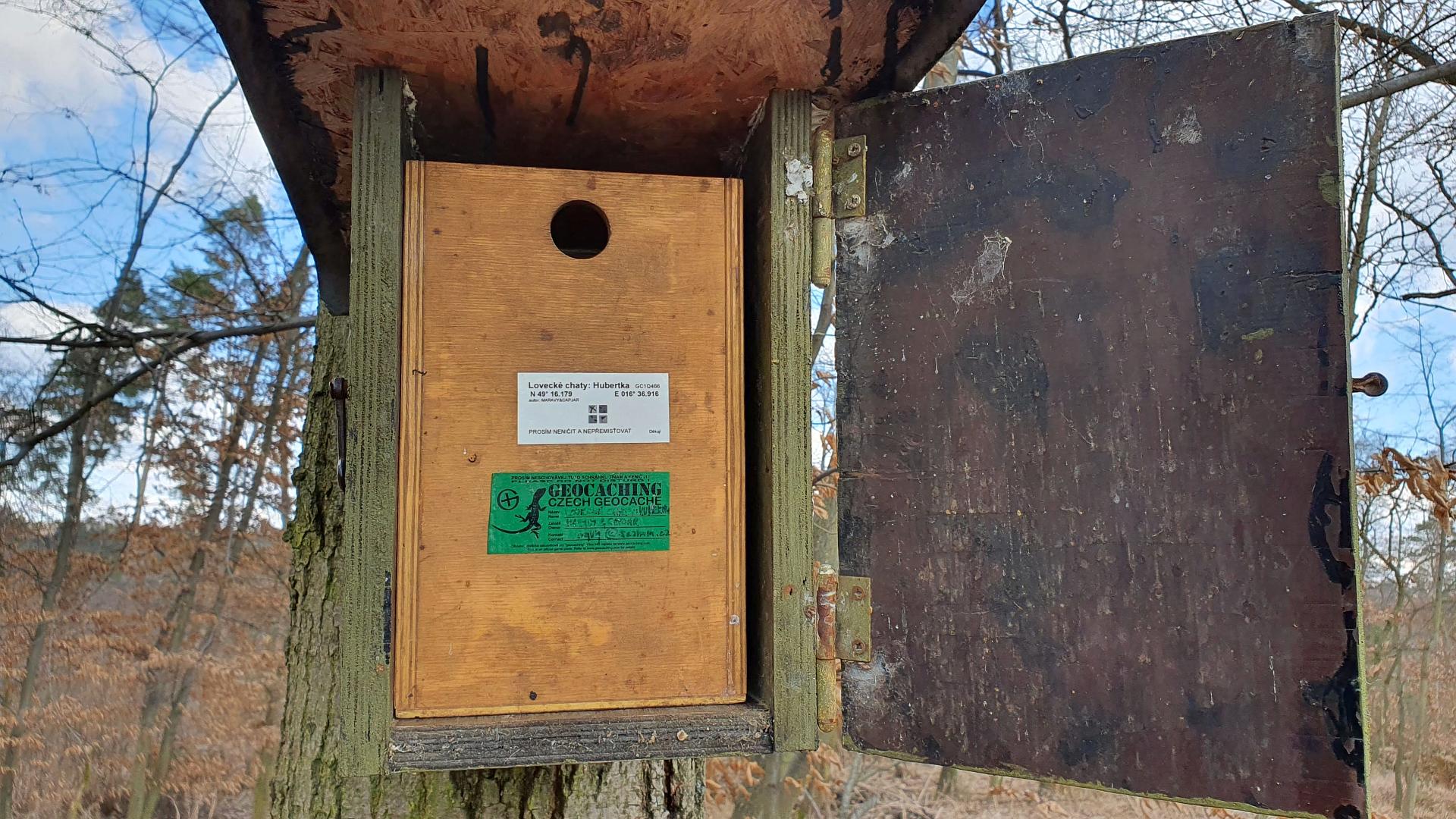 Místo toho se vydáme po modré turistické značce do kopce, ale ještě před rozcestím Písky zahýbáme ostře vpravo, protože se chceme podívat na místo, kde kdysi stávala lovecká chata Hubertka. Chata, postavená kolem roku 1939 jako kopie srubu ze Zakarpatské Ukrajiny, už tam není – v šedesátých letech byla rozebrána a přenesena do Křtinského arboreta, kde ji můžeme obdivovat dodnes. Na místě původní chaty Hubertka je dnes moc pěkně vyvedená geocache GC1Q466 Lovecké chaty: Hubertka.