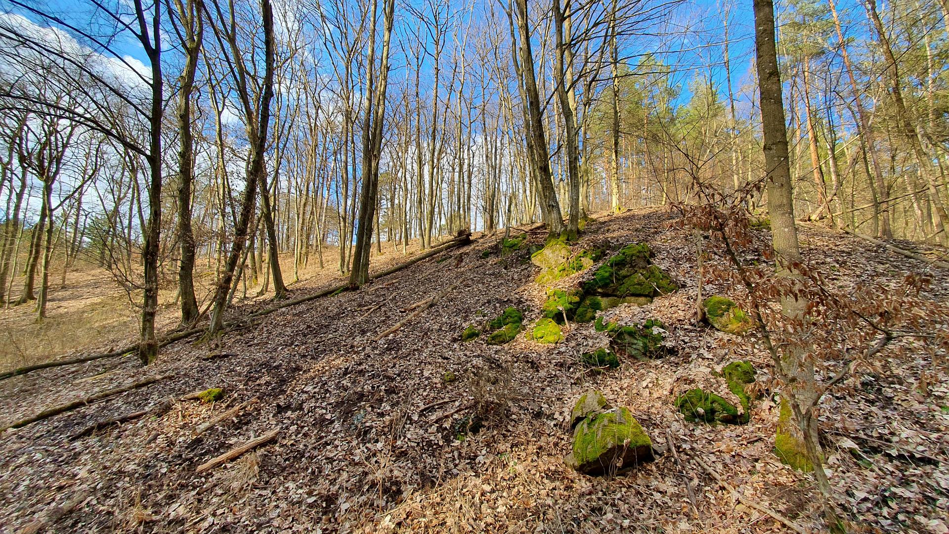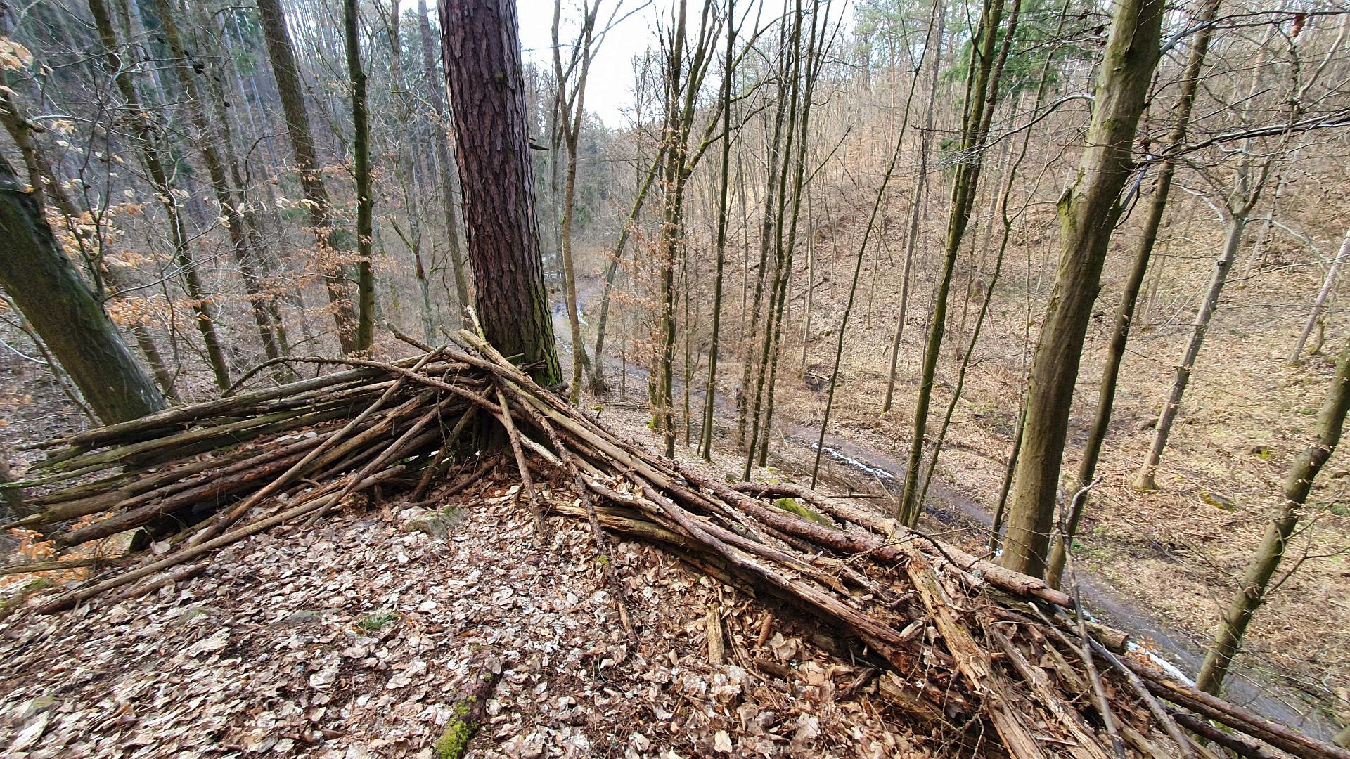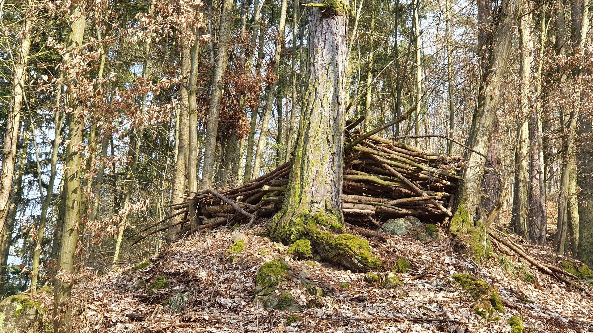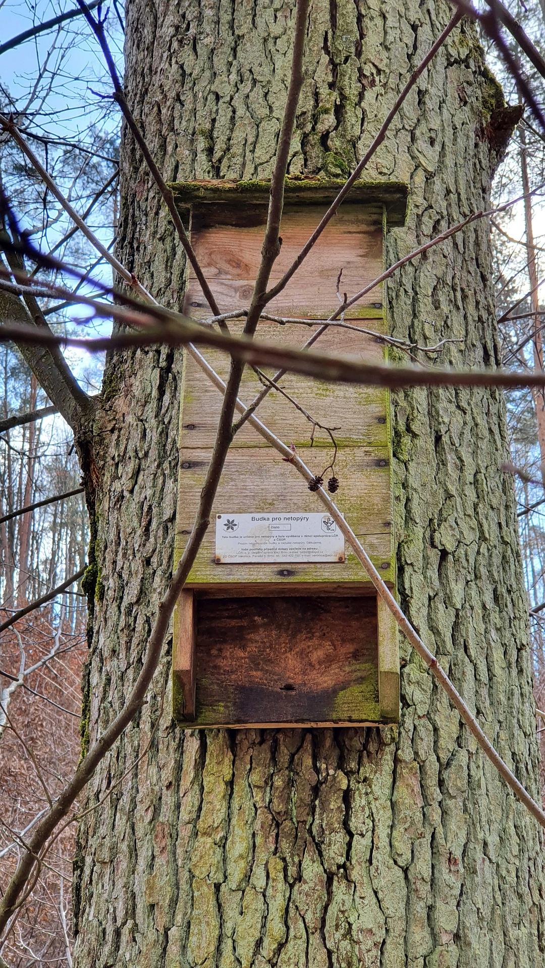 Místo toho se vydáme po modré turistické značce do kopce, ale ještě před rozcestím Písky zahýbáme ostře vpravo, protože se chceme podívat na místo, kde kdysi stávala lovecká chata Hubertka. Chata, postavená kolem roku 1939 jako kopie srubu ze Zakarpatské Ukrajiny, už tam není – v šedesátých letech byla rozebrána a přenesena do Křtinského arboreta, kde ji můžeme obdivovat dodnes. Na místě původní chaty Hubertka je dnes moc pěkně vyvedená geocache GC1Q466 Lovecké chaty: Hubertka.