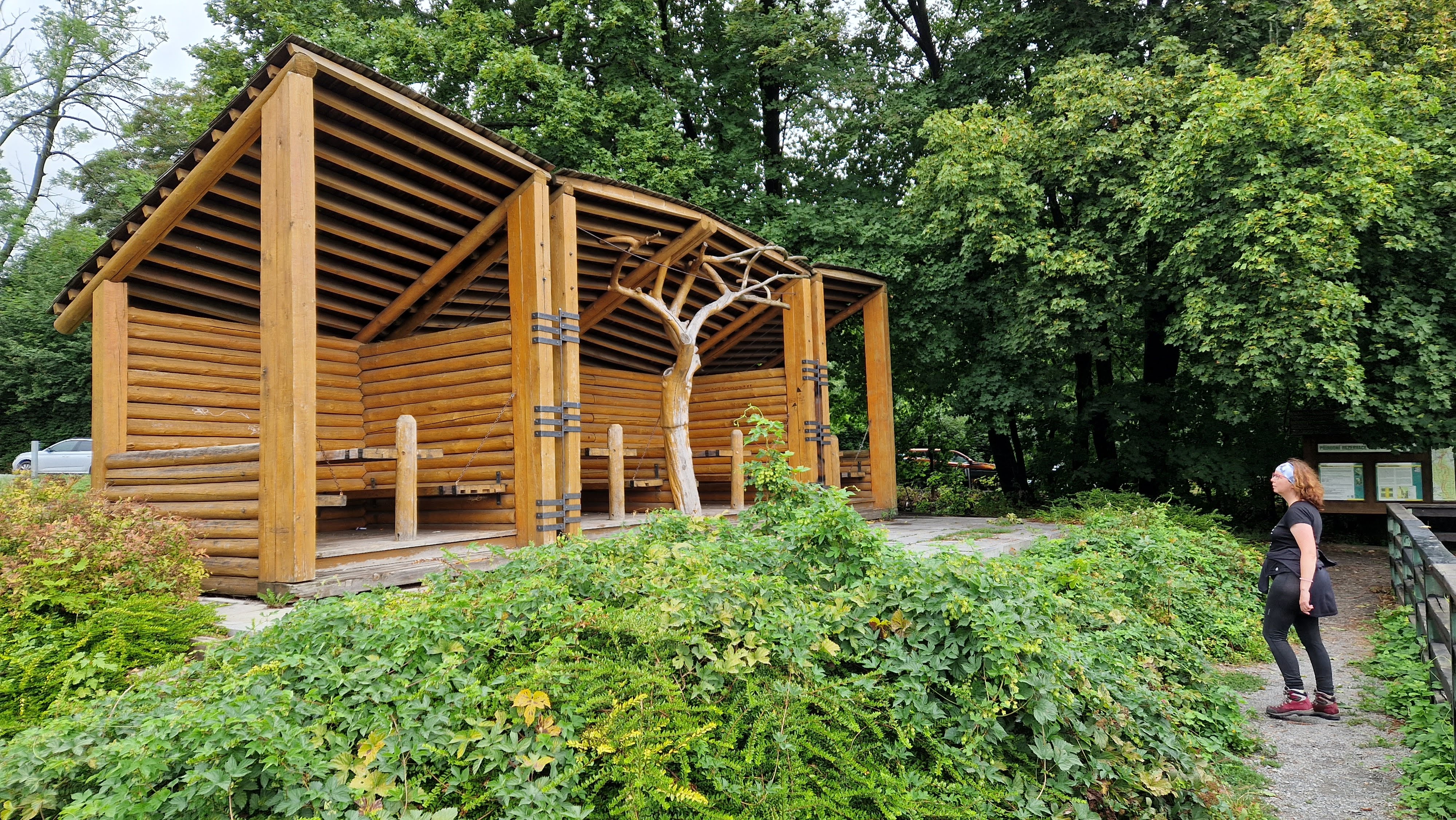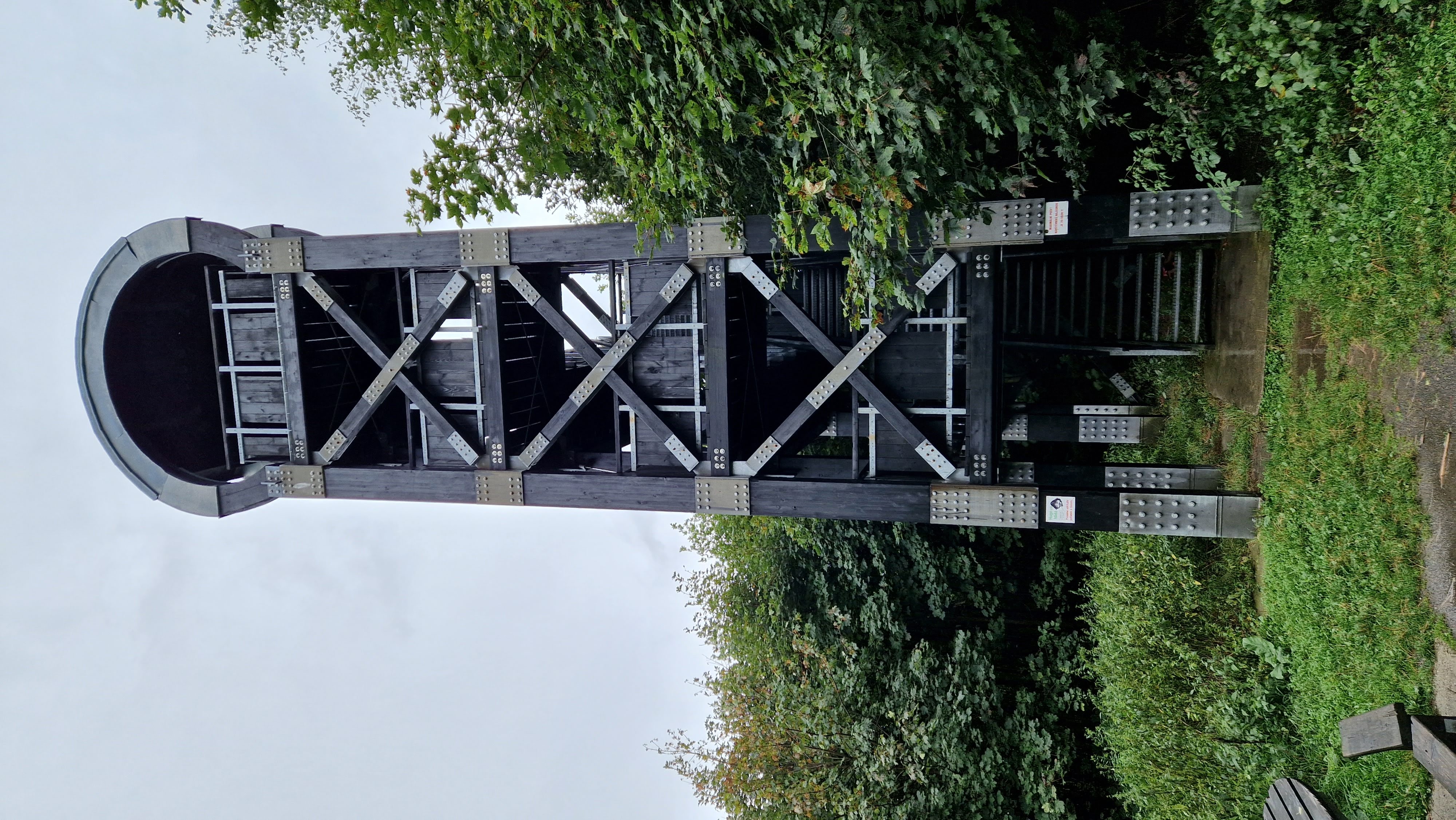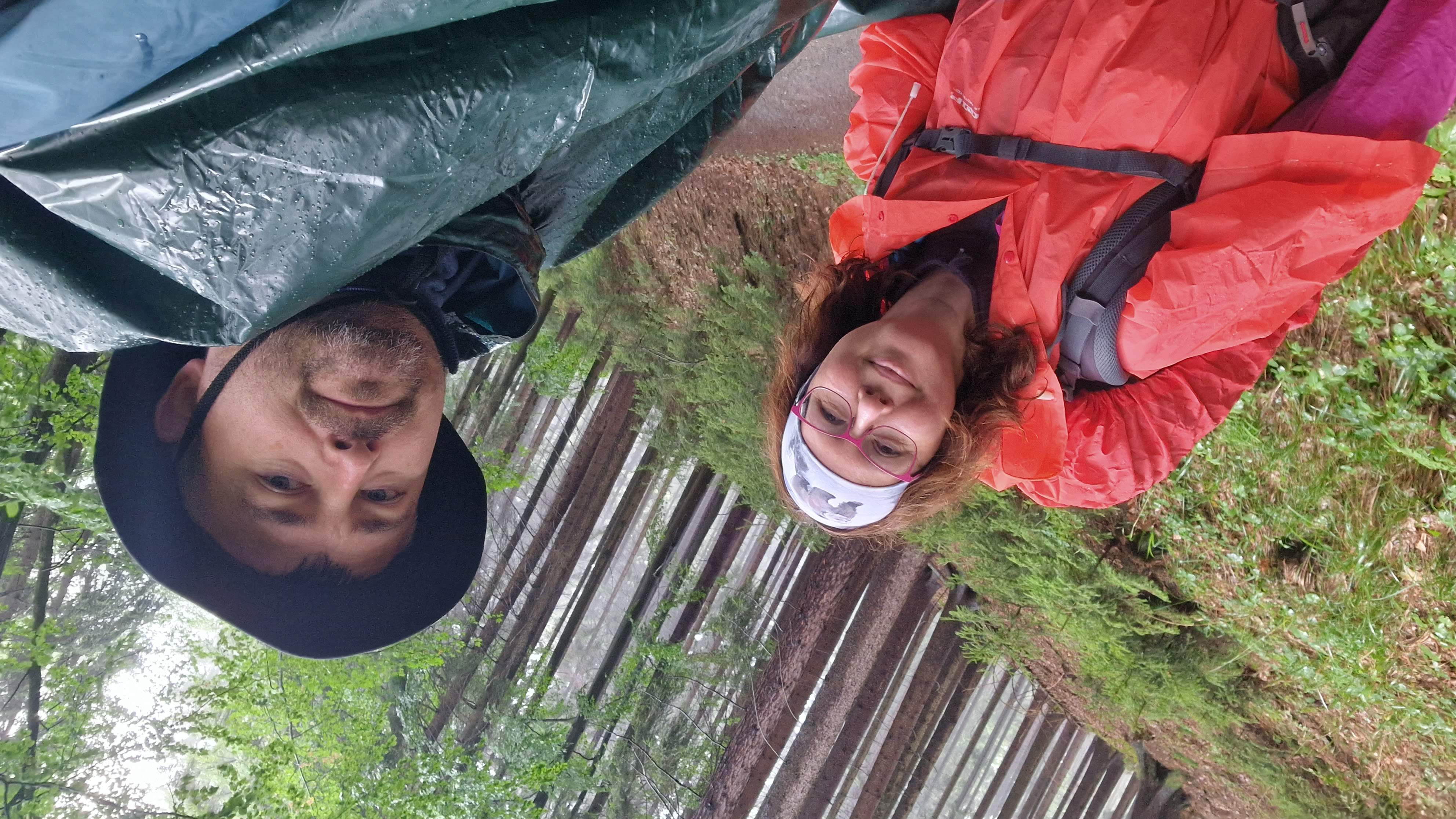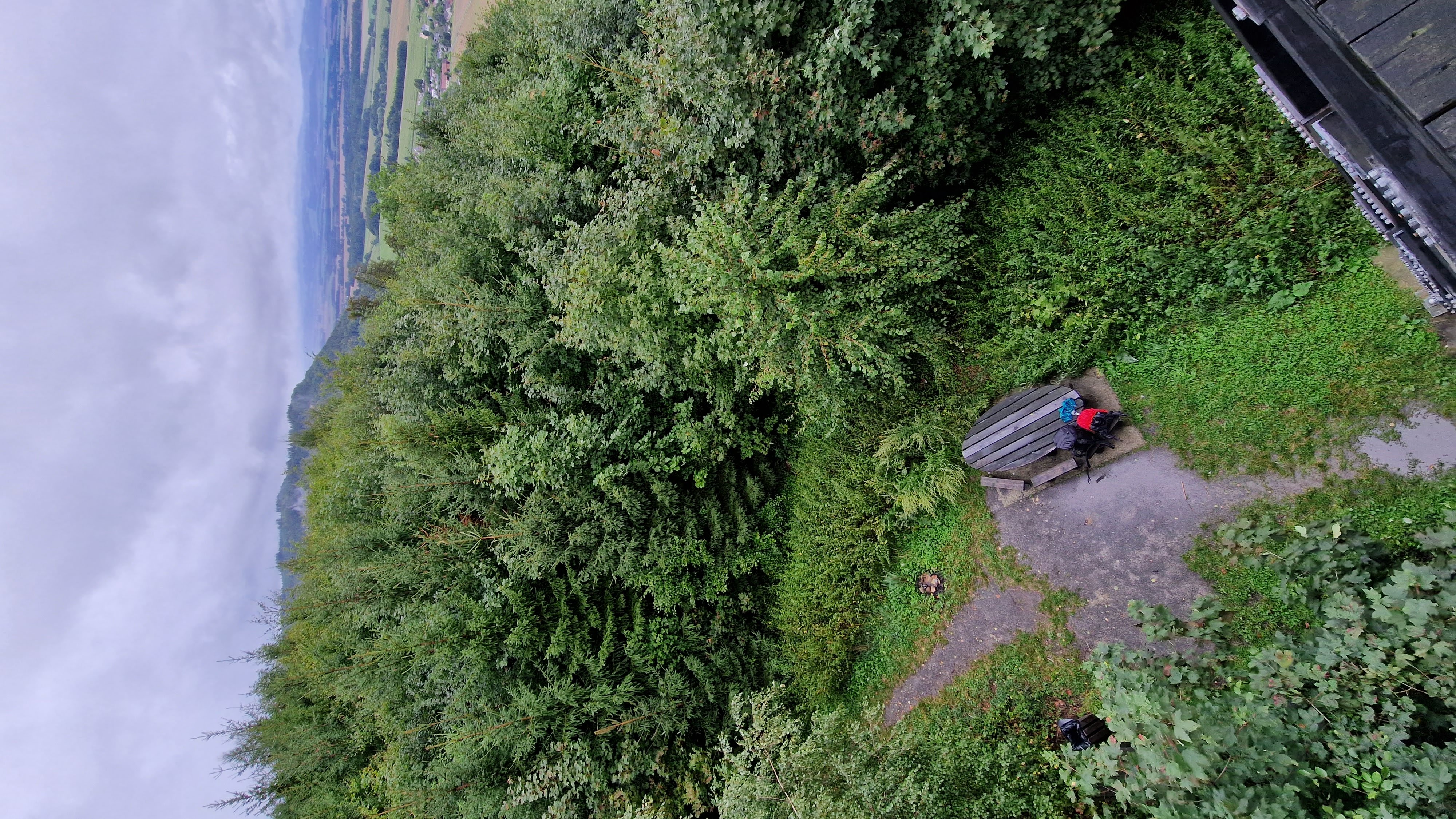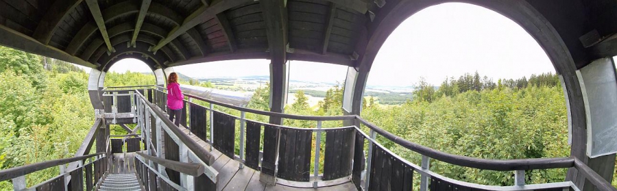 Cesta vedla nejdříve po žluté do kopce a pak dále k Dětřichovské hájence, odkud jsme pokračovali dál po naučné stezce až na rozhlednu Strážný vrch. Cestou přestalo pršet, takže jsme si pod zajímavou rozhlednou, které vrchol má připomínat důlní haicmany, uvařili čaj a posvačili chleba s paštikou.